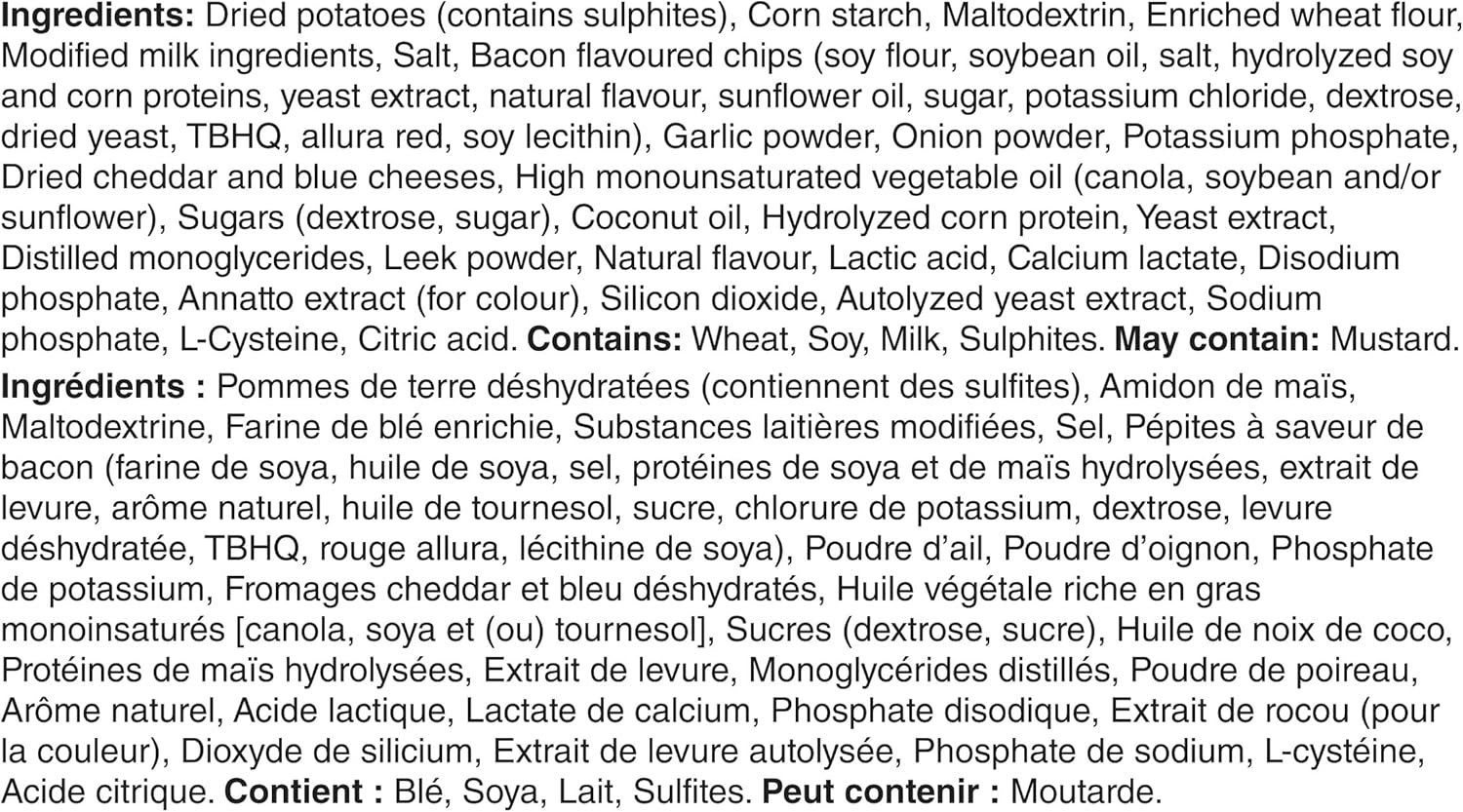 REAL INGREDIENTS: Packaged food is made with 100% real potatoes and naturally flavoured cheddar and bacon