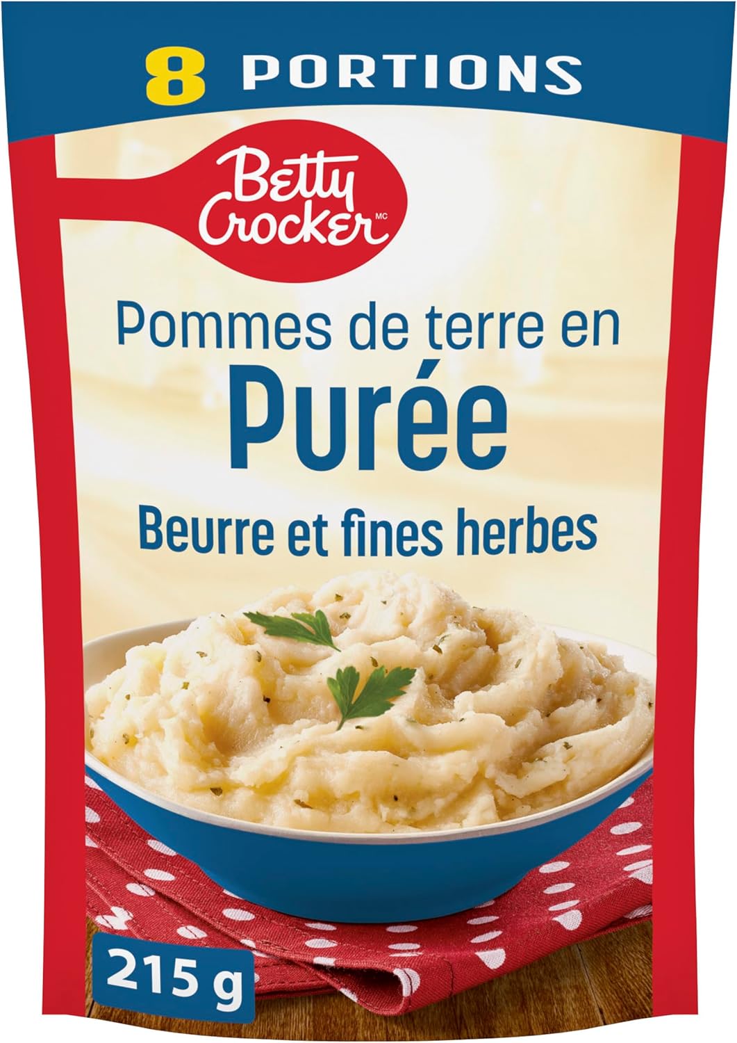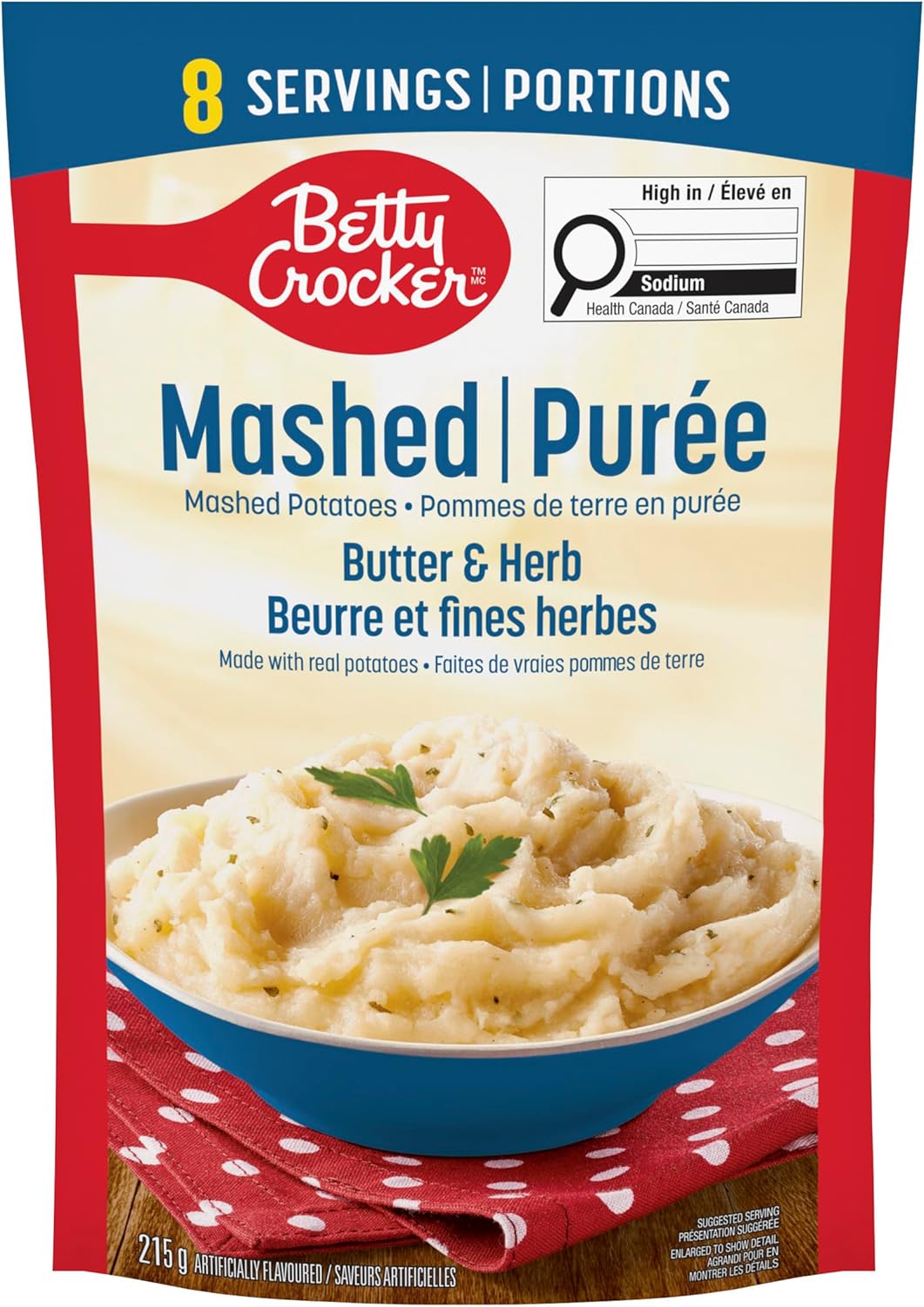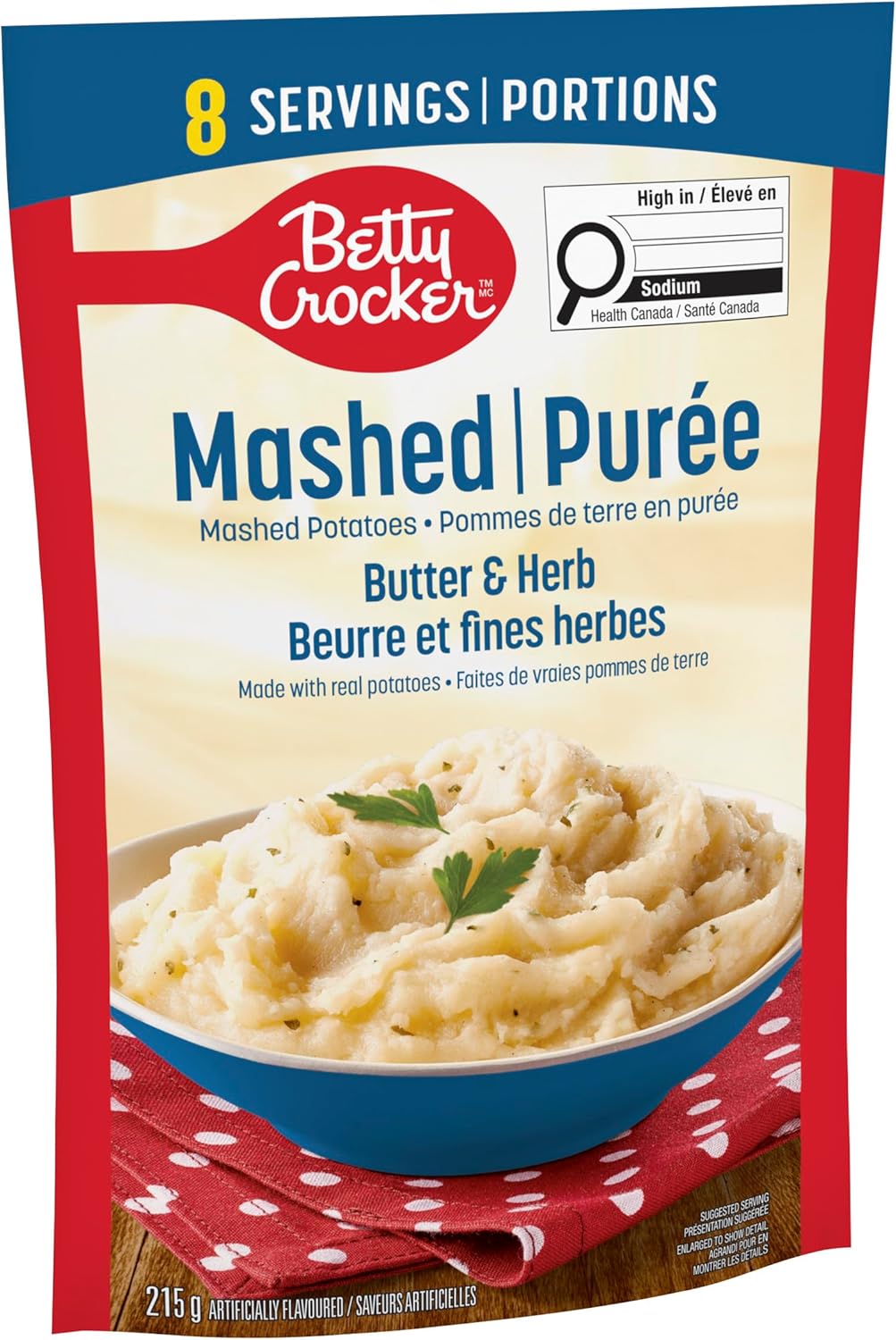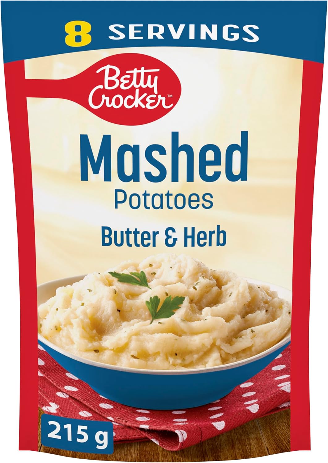Indulge in the rich and creamy taste of Betty Crocker Butter and Herb Mashed Potatoes, conveniently packaged in a pouch for a delightful and hassle-free culinary experience. Crafted with 100% real potatoes, the newly improved recipe is blended with delectable butter and aromatic herbs. Our instant mashed potatoes deliver a scrumptious, homemade flavour that is sure to make your taste buds dance with every bite. Perfect for busy weeknights or gourmet feasts, our mashed potatoes allow you to enjoy a delicious and time-saving side dish. Made with high-quality mashed potatoes flakes, this side dish elevates any meal and brings a sense of desire and satisfaction to the table. Satisfy your cravings and impress your loved ones with the authentic taste of Butter and Herb Mashed Potatoes. Contains eight servings for a total of 215 g.