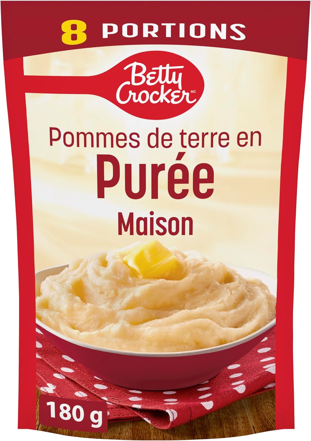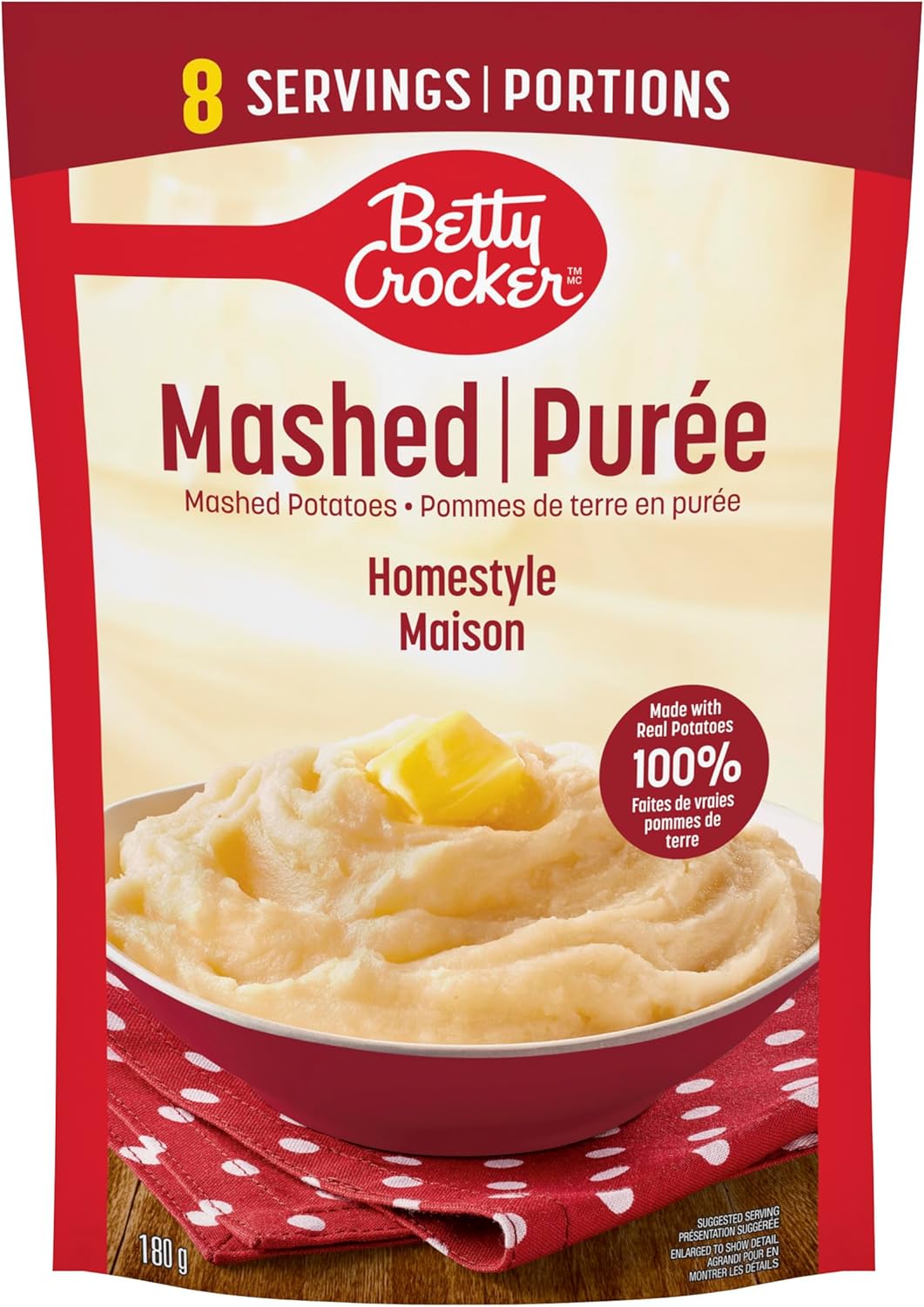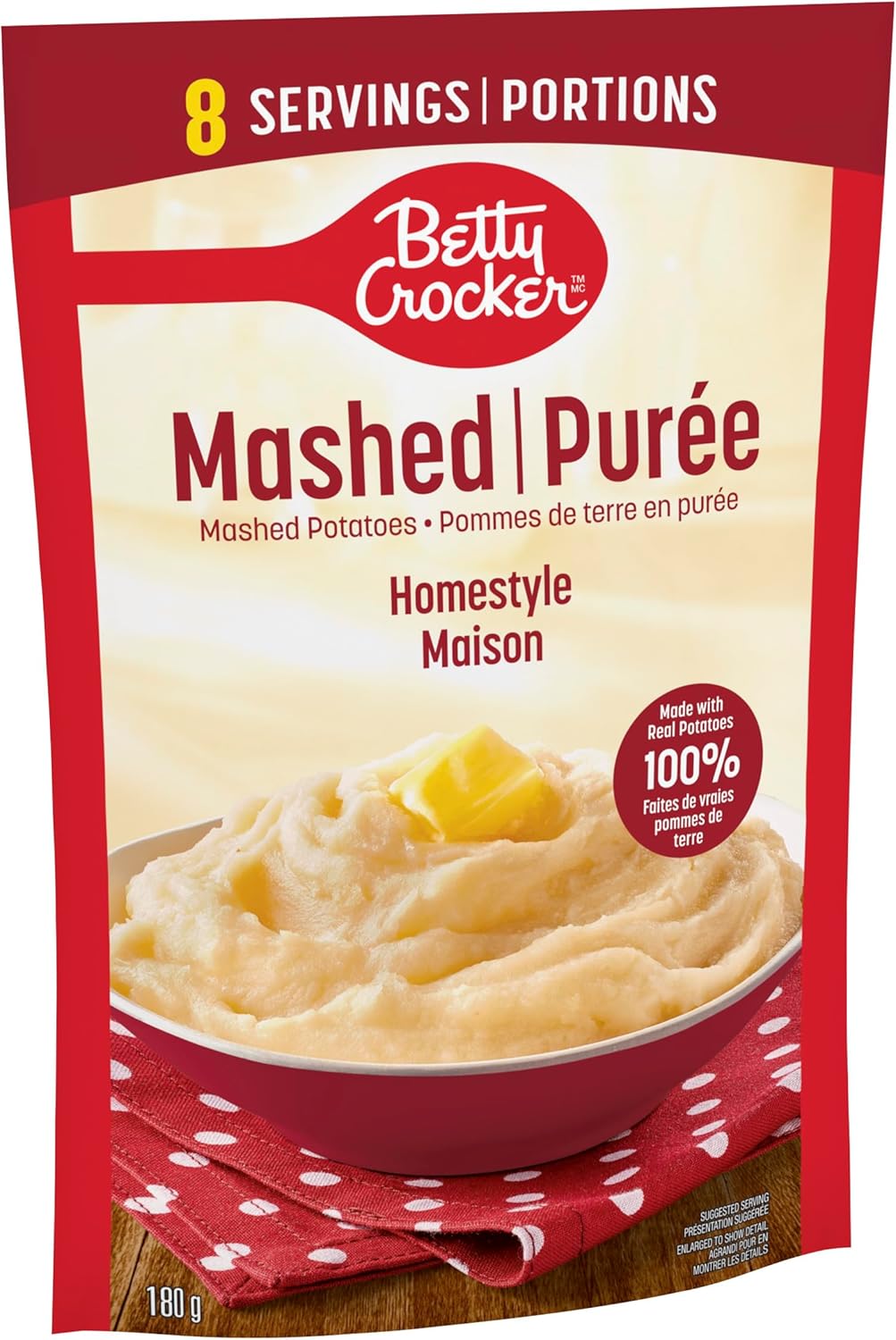 Indulge in the rich and creamy taste of Betty Crocker Homestyle Mashed Potatoes, conveniently packaged in a pouch for a delightful and hassle-free culinary experience. Crafted with 100% real potatoes, the Homestyle Mashed Potatoes deliver a scrumptious, homemade flavour that is sure to make your taste buds dance with every bite. Perfect for busy weeknights or gourmet feasts, our mashed potatoes allow you to enjoy a delicious and time-saving side dish. Made with high-quality mashed potatoes flakes, this side dish elevates any meal and brings a sense of desire and satisfaction to the table. Satisfy your cravings and impress your loved ones with the authentic taste of Homestyle Mashed Potatoes. Contains eight servings for a total of 180 g.