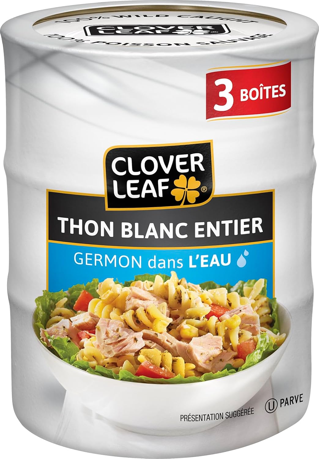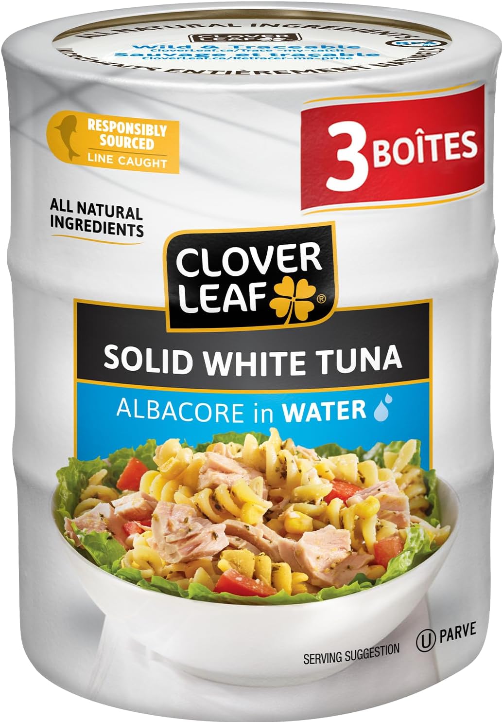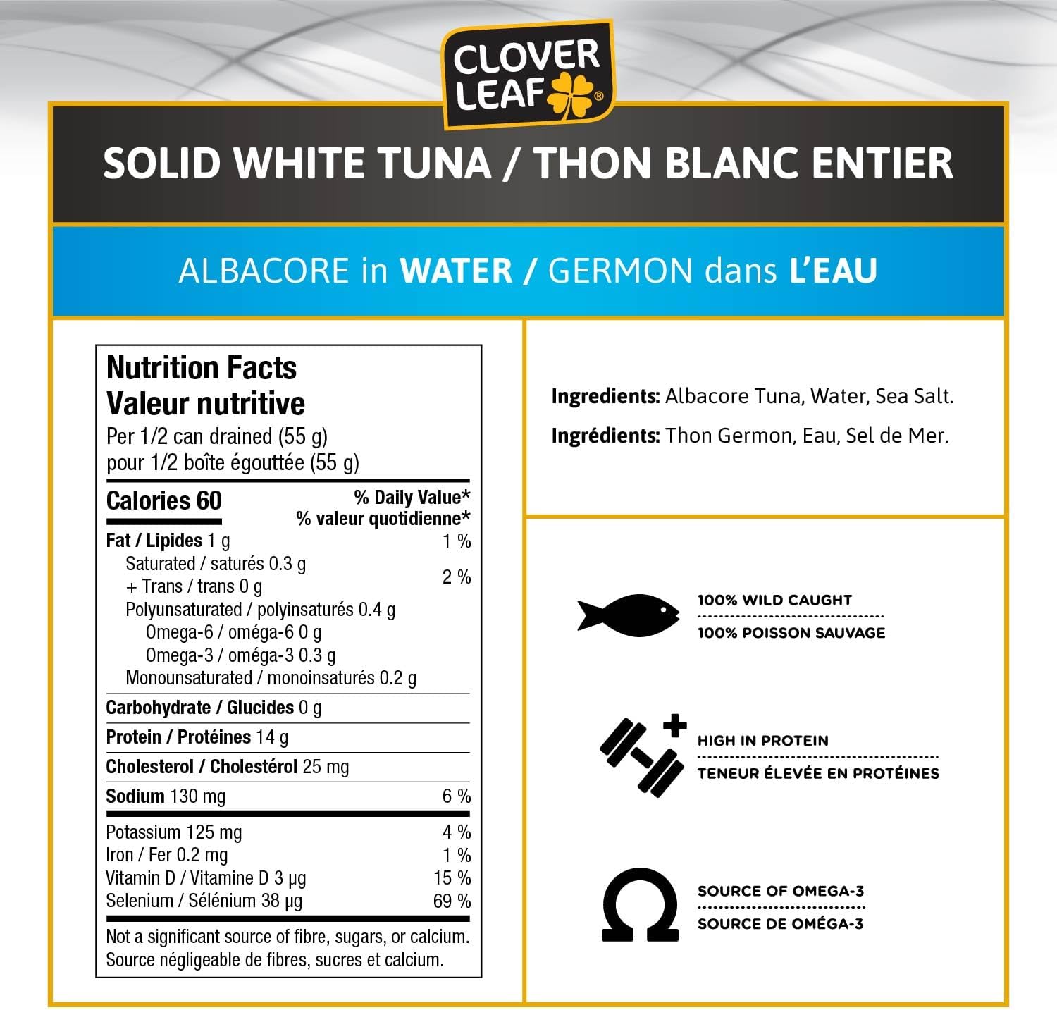 100% WILD CAUGHT: Clover Leaf Solid White Albacore Tuna in Water 3-pack has 3 x 170g canned tuna; Contains 100% wild caught albacore tuna, water and sea salt; Our canned white tuna is creamy and white with a slight pink hue, and has a mild flavour