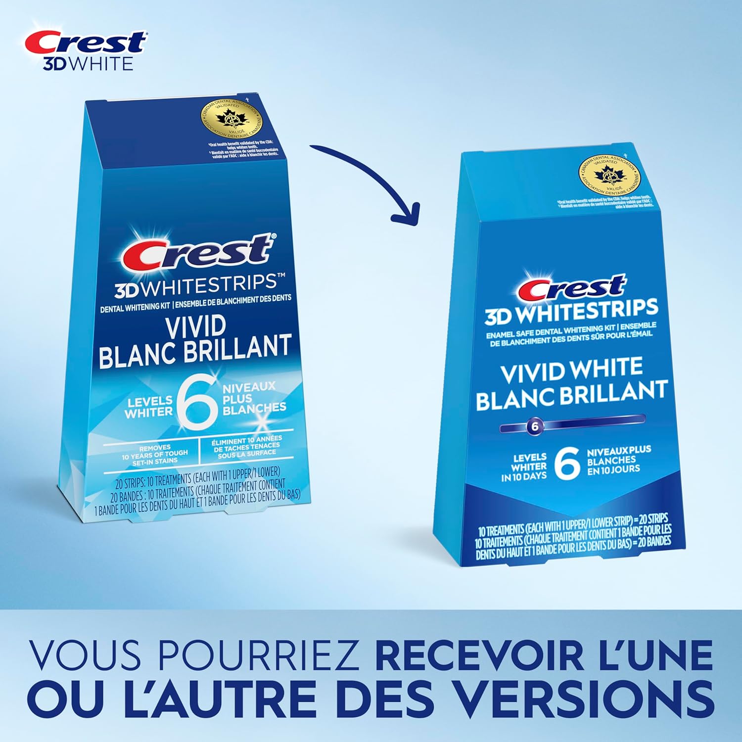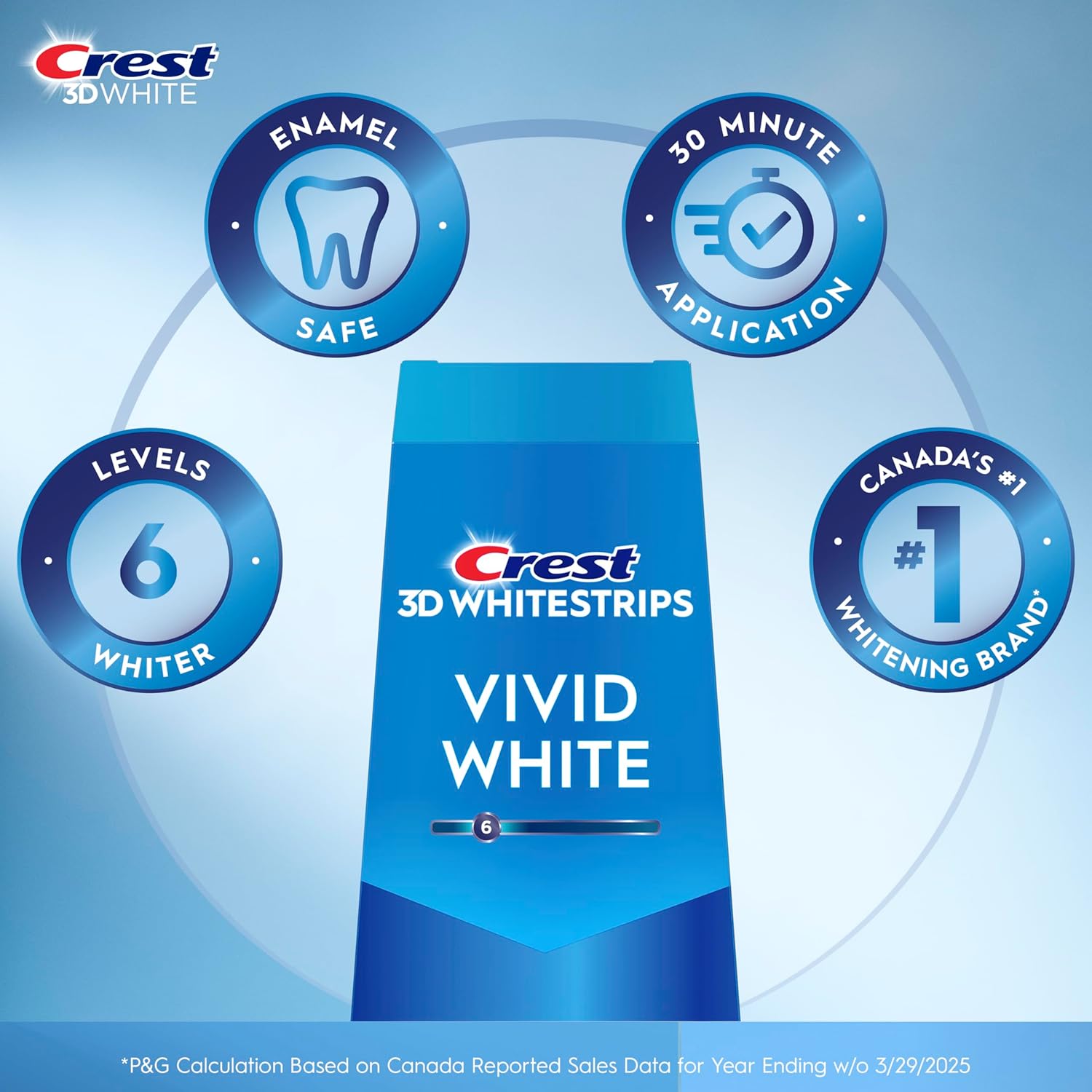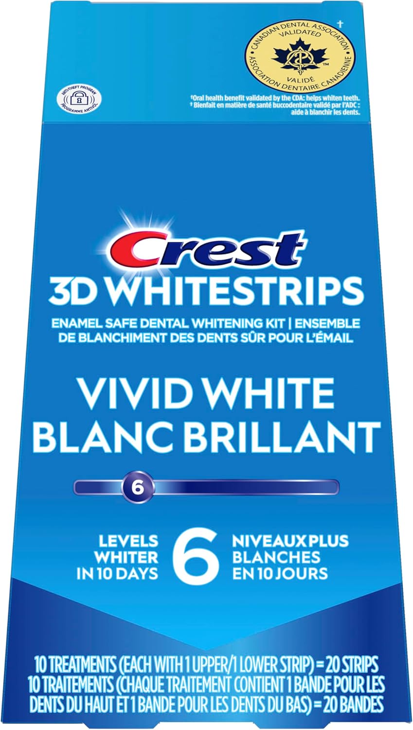 Want to get a whiter smile at home? Choose Crest 3DWhitestrips Vivid White and get a brighter, whiter smile in just 10 days. Made by Canada’s #1 Whitening Brand*, this 30-minute teeth whitening treatment makes it easy to whiten your teeth without leaving the house. It’s been validated by the Canadian Dental Association and uses the same enamel safe teeth whitening ingredient as dentists. Try the Vivid White teeth whitening kit and get 100% noticeably whiter teeth, guaranteed. Plus, the Advanced Seal Technology’s comfortable, no-slip grip keeps strips in place so you can talk and even drink water while whitening your teeth. Simply apply Crest 3DWhitestrips Vivid White for 30 minutes a day for 10 days. This pack includes 20 teeth whitening strips, 10 for your top teeth and 10 for your bottom teeth, to be used over the course of 10 days. *P&G Calculation Based on Canada Reported Sales Data for Year Ending w/o 3/29/2025