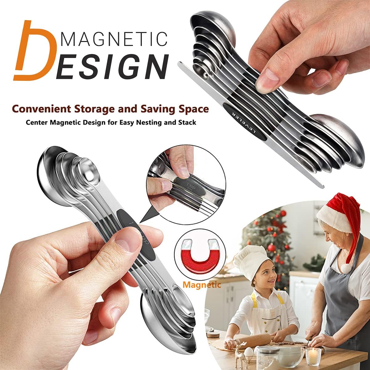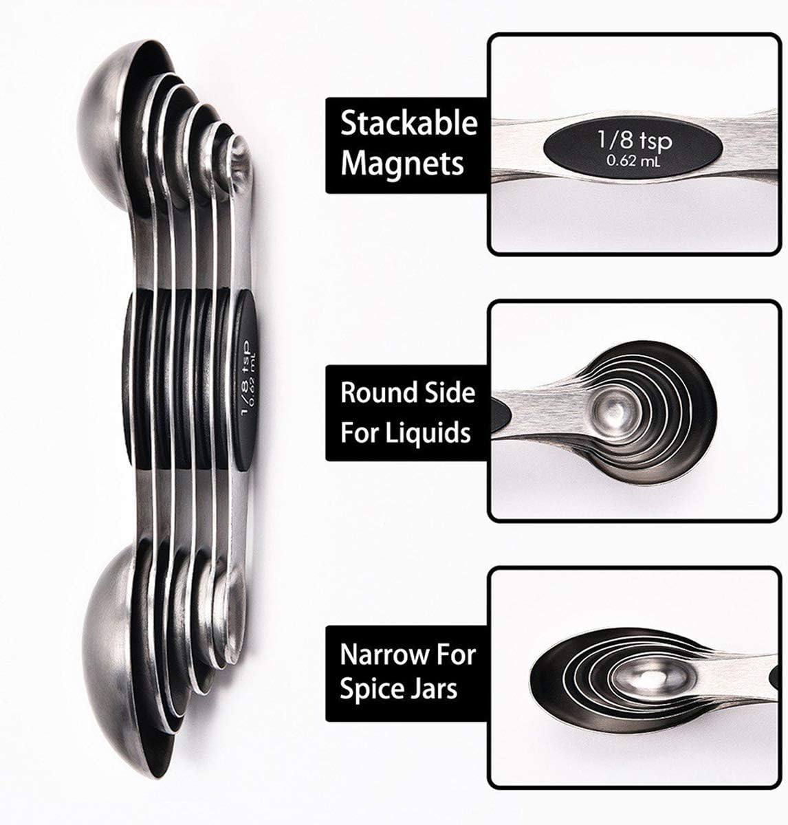 MAGNETIC FOR EASY USE AND STORAGE – These magnetic spoons let you use one spoon at a time and then they nest together for easy storage. Quickly grab the spoon you need without having to fumble with opening and closing a ring. They even have U.S. and metric measurement markings that are easy to read and won’t fade or rub off. You’ll wonder how you ever lived without them.