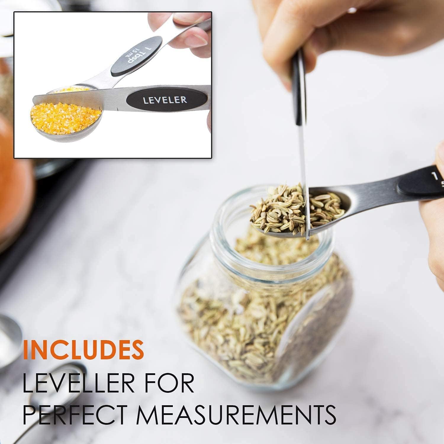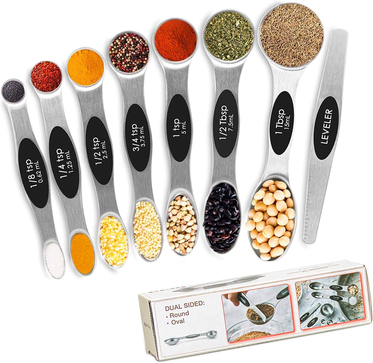 DOUBLE SIDED MEASURING SPOONS – The measuring spoons double ended design makes it compatible for measuring the dry and liquid ingredient, round end measuring liquid ingredient , narrow oval end can fit in most spice jars or bottles. Measuring spoons flat on the bottom and they don’t spill. With the included leveler you can measure the exact amount for your recipes.
