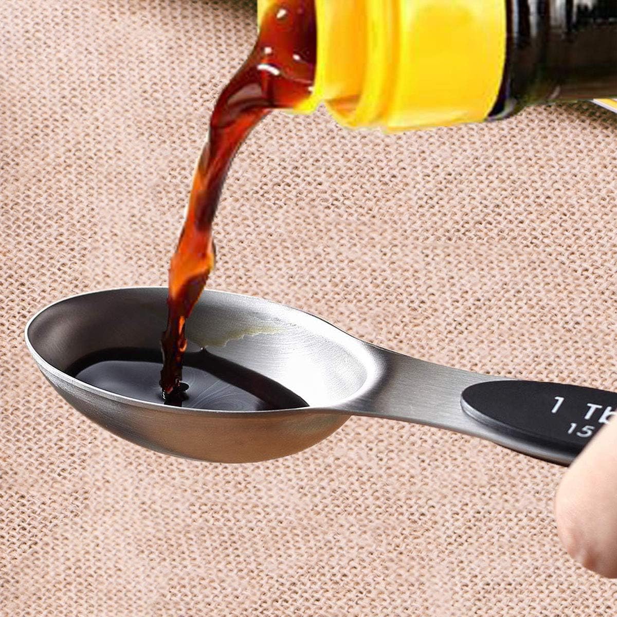 The Dual-end Design Measuring Spoons compatible for measuring the dry and liquid items, round end measuring liquid ingredient , narrow oval end can fit in most spice jars or bottles.