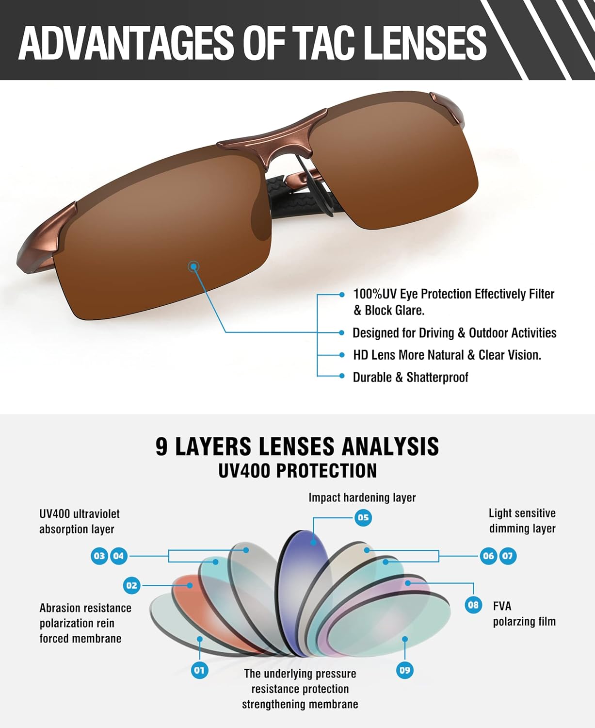 Customers like the quality, fit, and appearance of the sunglasses. They mention the lenses are clear and block sun well. Customers also appreciate the lightweight design, sun protection, and carrying case. However, some customers differ on the durability.