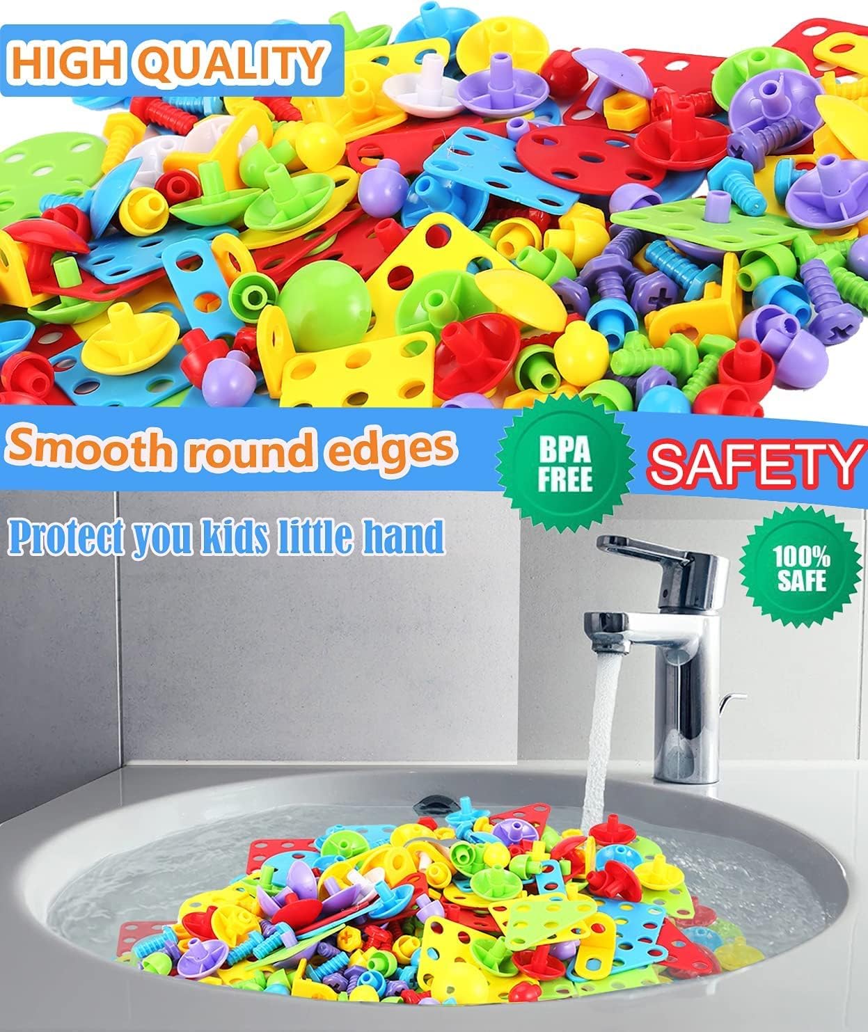 Safe and durable: Made of non-toxic and durable ABS plastic, food-grade material; smooth edge of each tile will never hurt baby’s little hands, harmless to human and environment, meets toy safety standards.