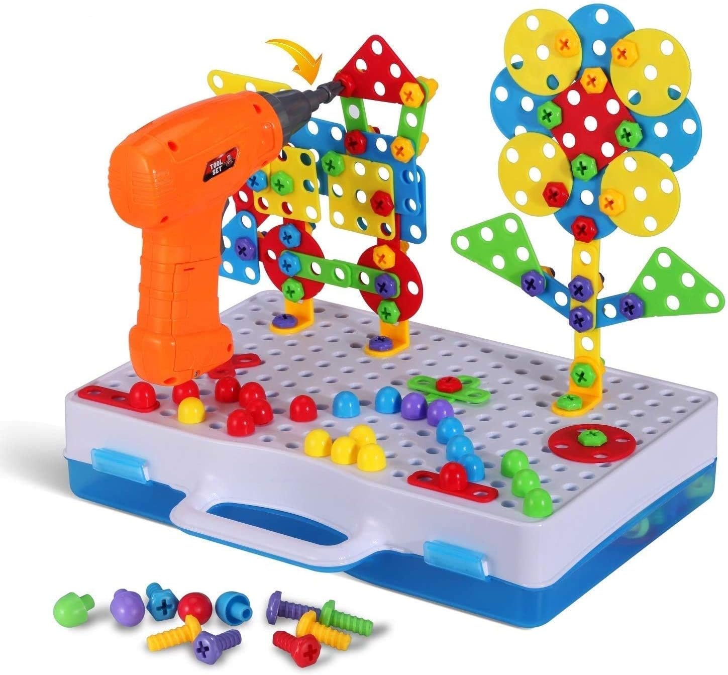 More fun for kids: This building block comes with 244 pieces that include many blocks nuts & bolts, wheels, and funning interchangeable electric screwdriver (requires 2 AA batteries, not included). Your kids can use the electric screwdriver assembling the plates onto the base grid to build 3D and 2D crafts like a lion, truck, butterfly, flowers, bird, helicopter, etc. Kids learn colors and shapes while playing, develop their creativity and mind in new ways.