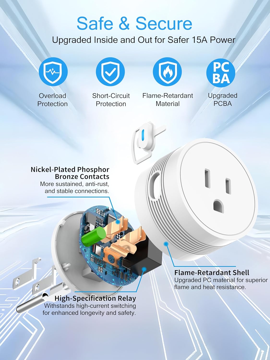 [Compact & Safe Design]: Flame-retardant housing, child safety shutters, and overload protection. FCC/ETL certified smart outlet for peace of mind.