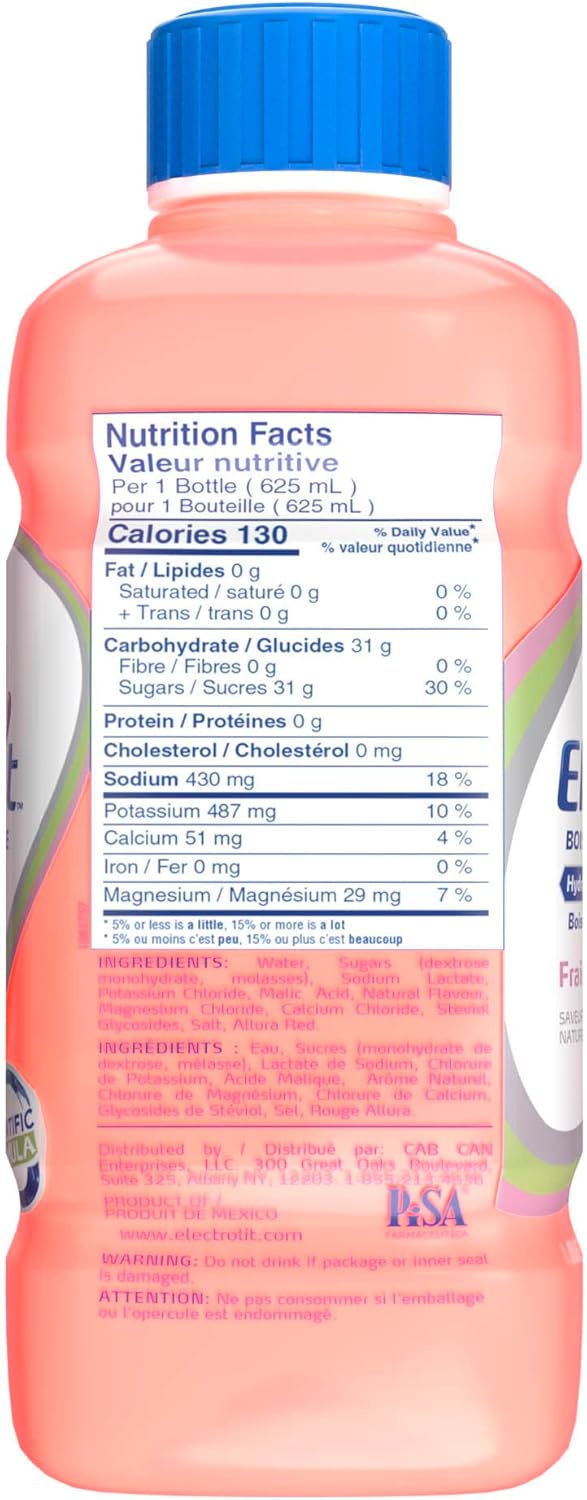 HYDRATE YOUR BODY Powerful Ingredients: 4 electrolyte minerals and 6 ion sources. Potassium: Avoid muscle spasms. Magnesium: Prevent cramps. Calcium: Helps metabolic process. Sodium Lactate: Prevents acid buildup. Sodium / Glucose: Essential for rehydration and recovery. IONS: Allows electrolyte absorption. Optimal Hydration Delivery: Well-balanced sugar and sodium ratio. Natural: No preservatives or artificial colors. A SCIENTIFICALLY FORMULATED PREMIUM HYDRATION BEVERAGE THAT REPLENISHES THE BODY AFTER: PHYSICAL ACTIVITY AND WORKING OUT: Our innovative formula hosts a combination of premium ingredients that aid in rapid recovery. Essential ingredients help with muscle spasms, acid buildup, electrolyte absorption, cramping and more. Electrolyte water can get the job done with a heaping dose of electrolytes like sodium, magnesium, potassium, and calcium. INTENSE HEAT Prolonged exposure to heat can lead to excessive sweating, which takes a toll on your body due to the loss of electrolytes. However, there is a way to gain back what you lost: Electrolit. This electrolyte water offers an optimal balance of electrolytes, (sodium, magnesium, potassium, calcium,) to prevent and treat dehydration. What better way to keep cool and fresh with an ice-cold Electrolit Strawberry-Kiwi? SICKNESS: Electrolit can help you replenish your electrolytes and bounce back faster so you can keep your life moving.”