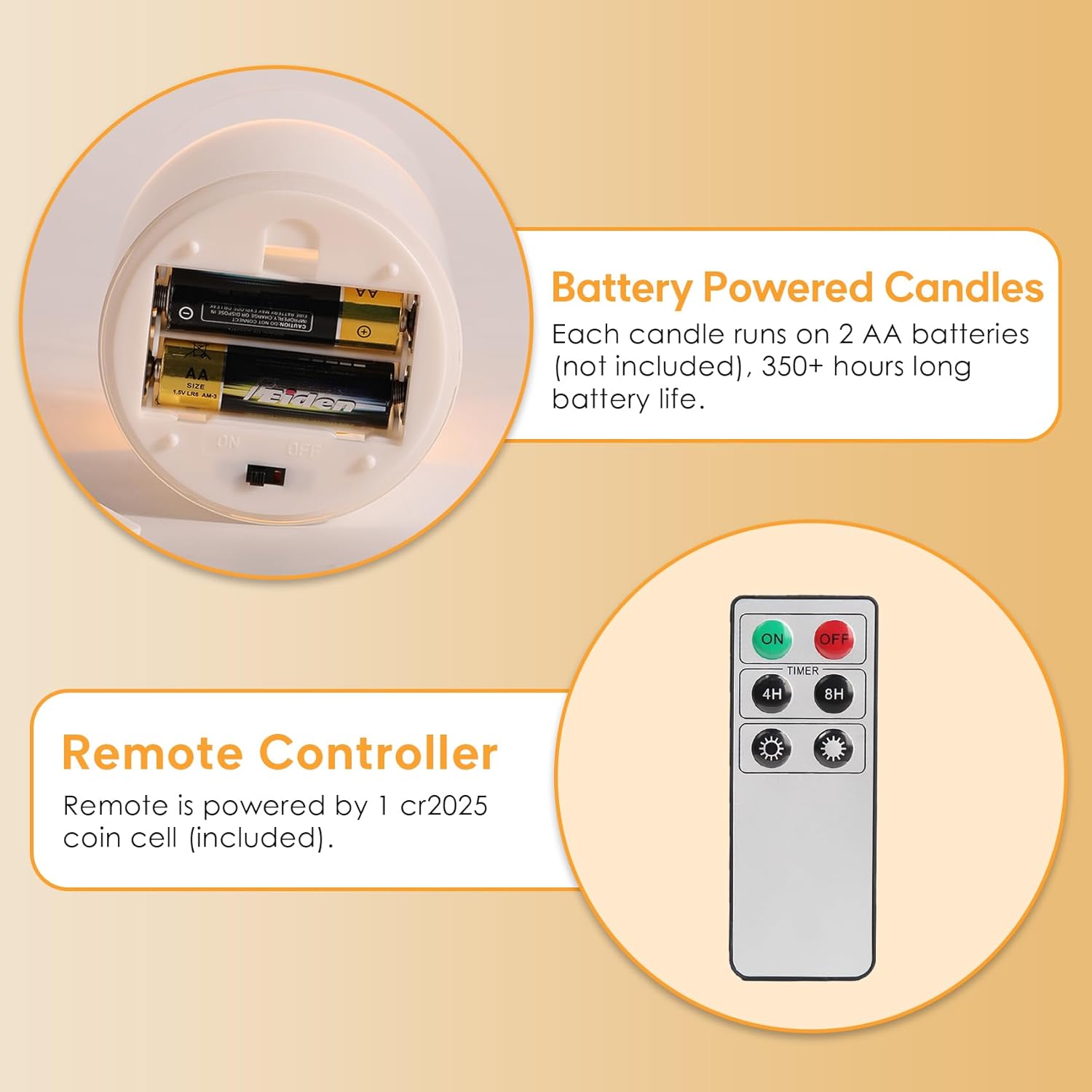 Battery Operated Candles – Each led candle is powered by 2 x AA battery ( not included) with flickering effect (fixed flame), lasting over 350 hours, LED bulb has a 50,000+ hours life.