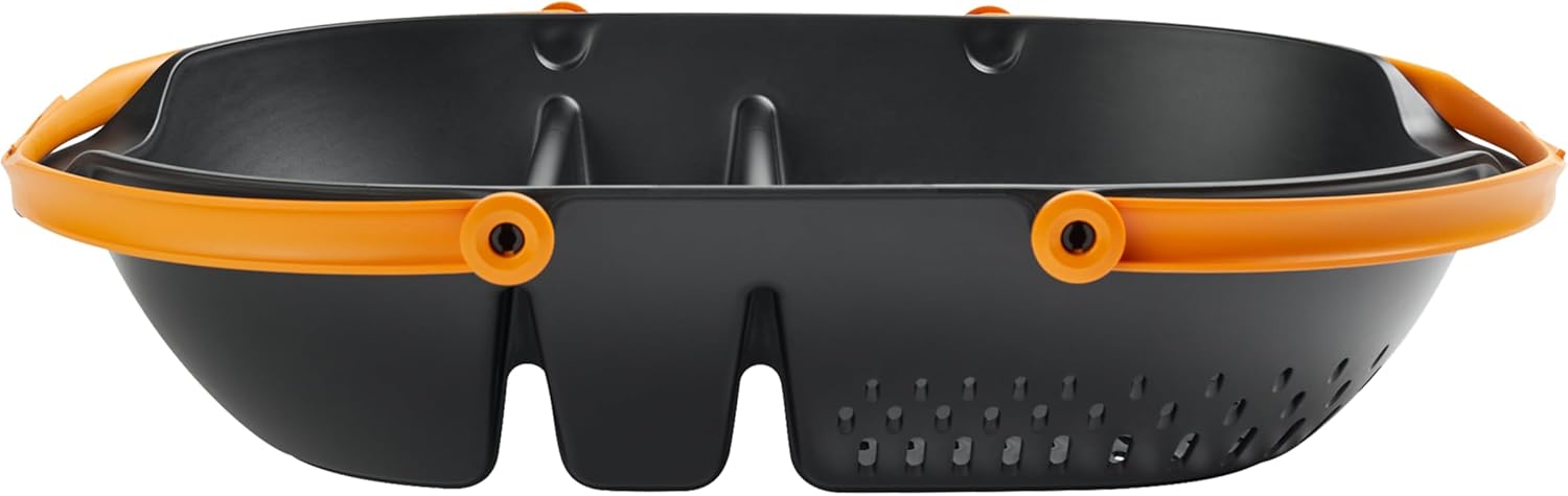 INNOVATIVE DESIGN: Colander side has drain holes for washing harvested produce; Enclosed side can be used for soaking or carrying clean produce or tools; Ergonomic side handles ideal for two-handed carrying; Folding handles interlock for comfortable, one-handed use