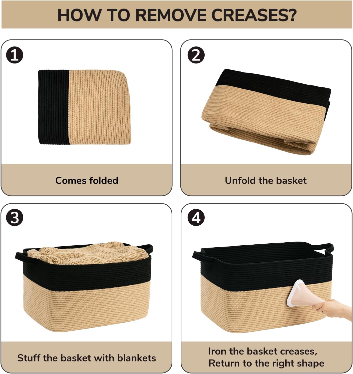 Note. The large basket is folded when shipping. It will turn back to its elegant shape quickly by filling it with towels or blankets, and ironing is a great idea to remove the creases more quickly. The large blanket basket can be washed by hand or machine, just put it into a laundry bag while machine washing.