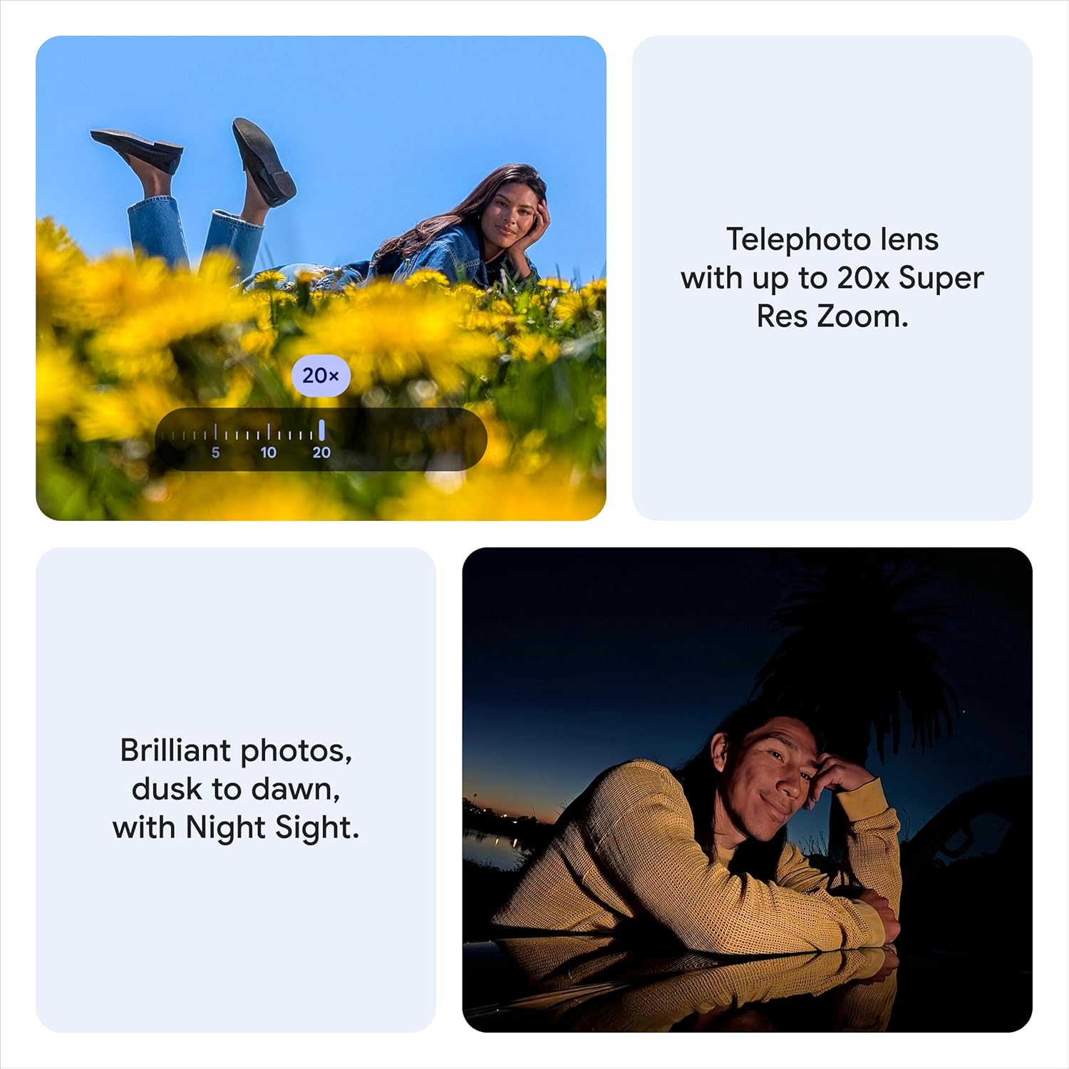The upgraded triple rear camera system has a new 5x telephoto lens with up to 20x Super Res Zoom for stunning detail from far away; Night Sight takes crisp, clear photos in low-light settings; and Camera Coach helps you snap your best pics[3]