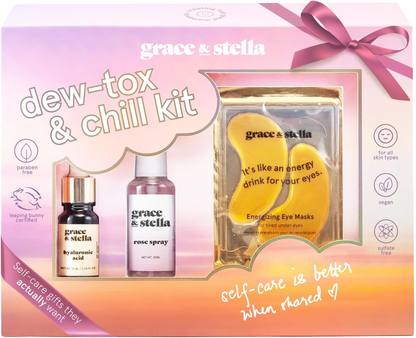 Glow Up Your Gifting Game – Give the gift of gorgeous skin with our Dew-Tox & Chill skincare gift set for women. If you’re looking for best friend gifts for women, stocking stuffers for adults, gifts for sister and gifts for girlfriend, our skin care set is a sure hit for self-care enthusiasts. It includes our gold eye patches (5 pairs), hyaluronic acid face serum (10 ml), and rosewater face spray (30 ml) for soft, beautifully dewy skin.