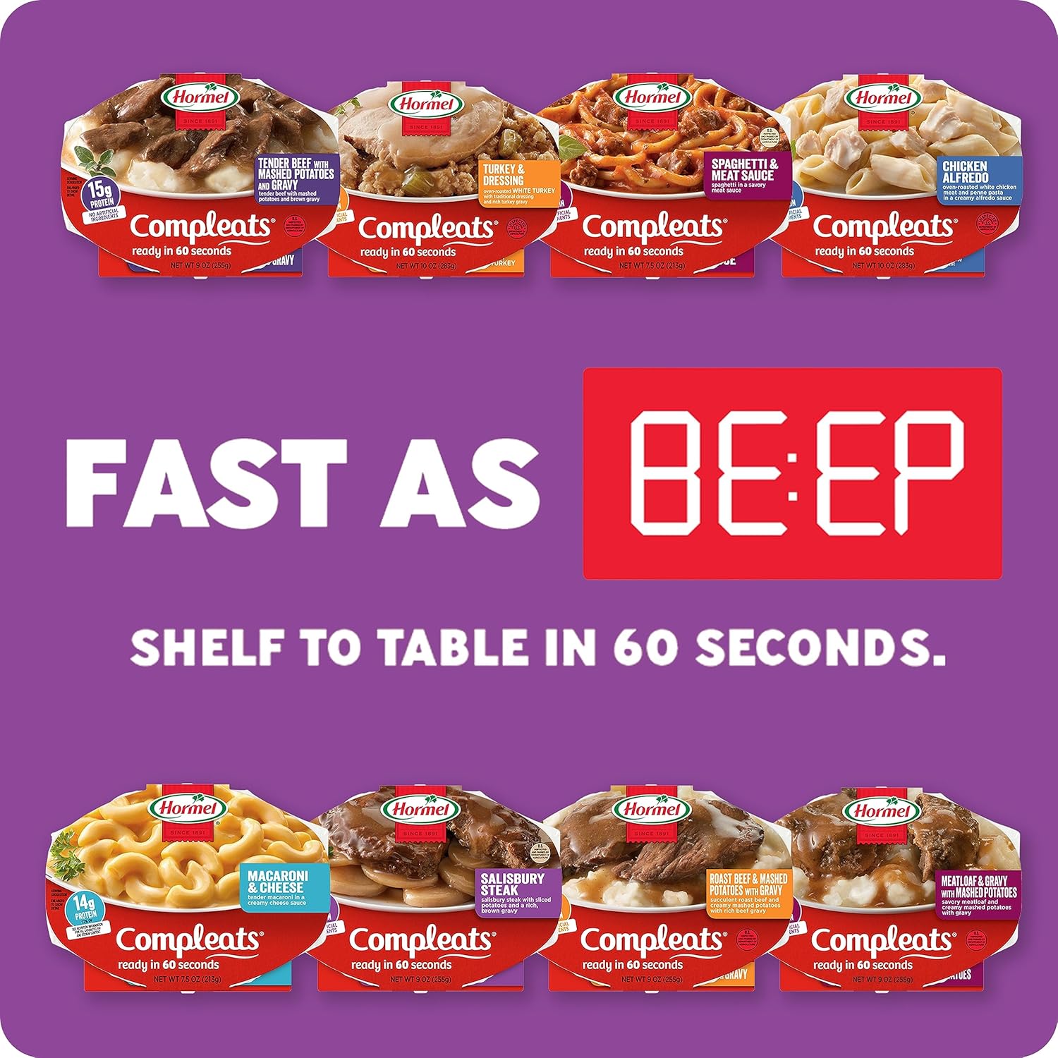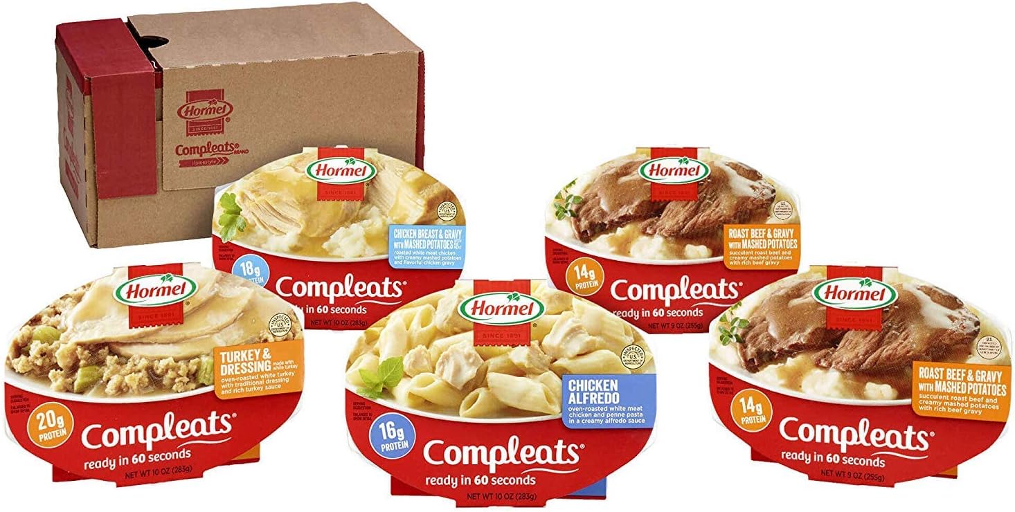 Stay satisfied with HORMEL COMPLEATS – Protein Variety Pack – Microwave Meals – No Refrigeration Needed (5 Pack). Our mouth-watering Microwave Meals are traditional favorites you can have any day of the year. HORMEL COMPLEATS delicious microwave meals are perfect for any quick meals, with no prep or clean-up needed. Real food, real fast. COMPLEATS is a trademark of Hormel Foods, LLC.