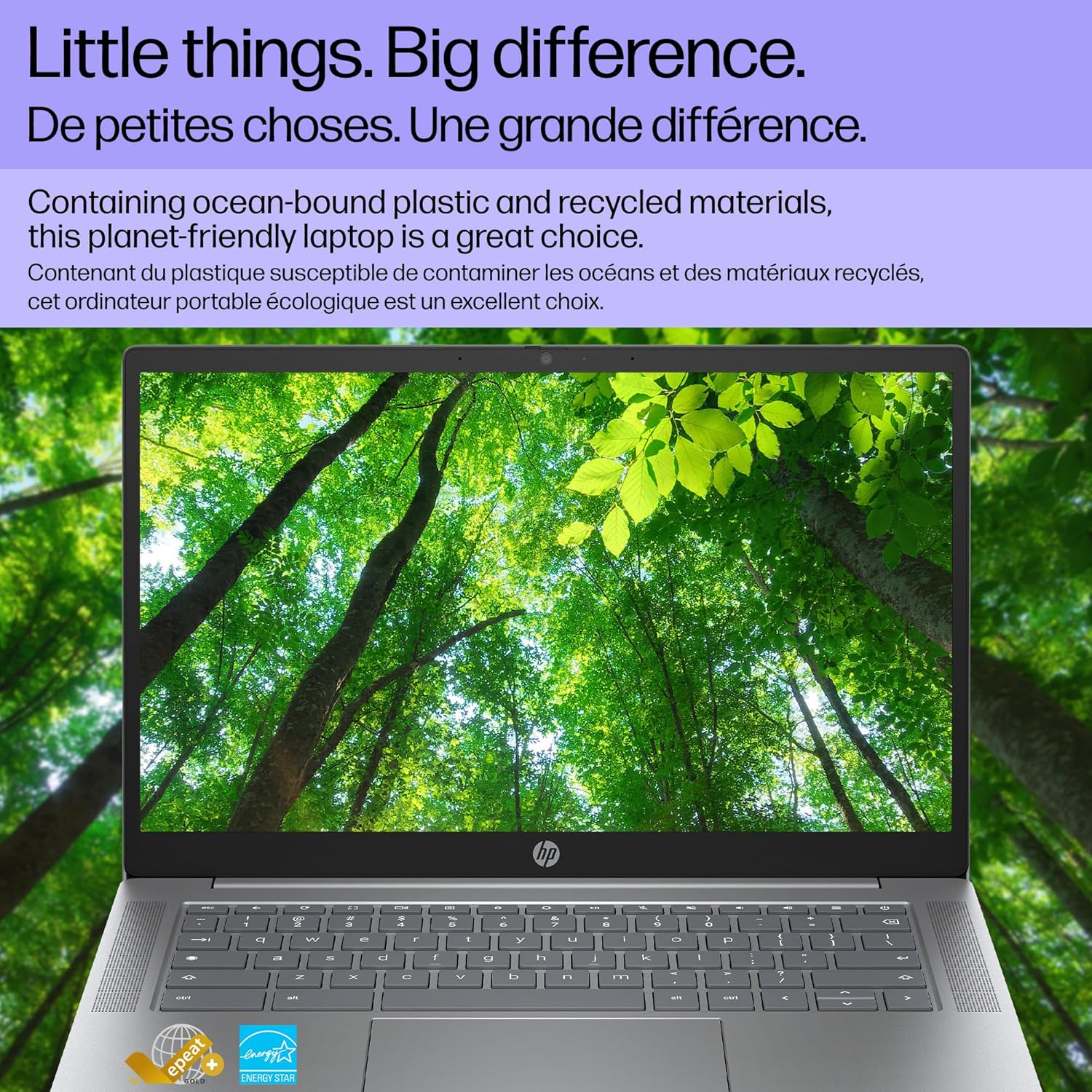 SUSTAINABLE DESIGN: Built with the future in mind, the HP Chromebook Plus uses ocean-bound plastic, post-consumer recycled plastics, and recycled aluminum. It is EPEAT Gold with Climate+ and ENERGY STAR certified, making it a better choice for a brighter tomorrow