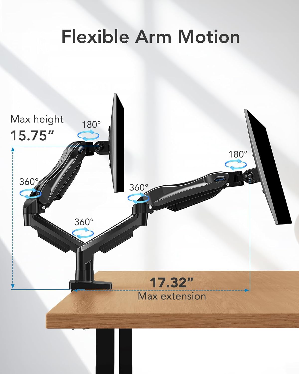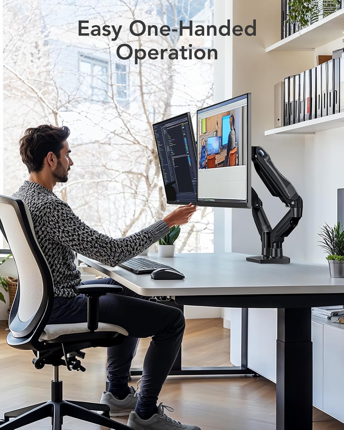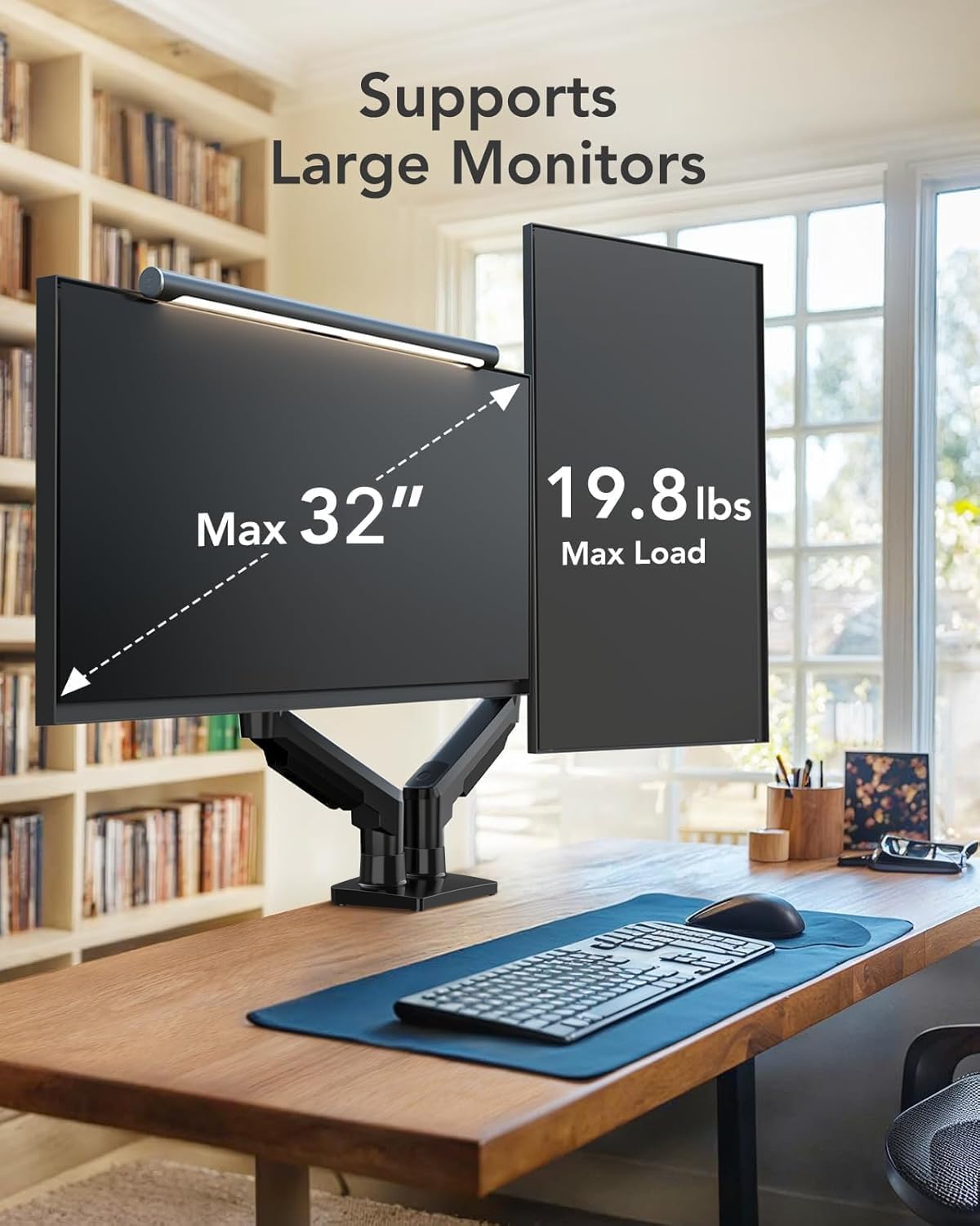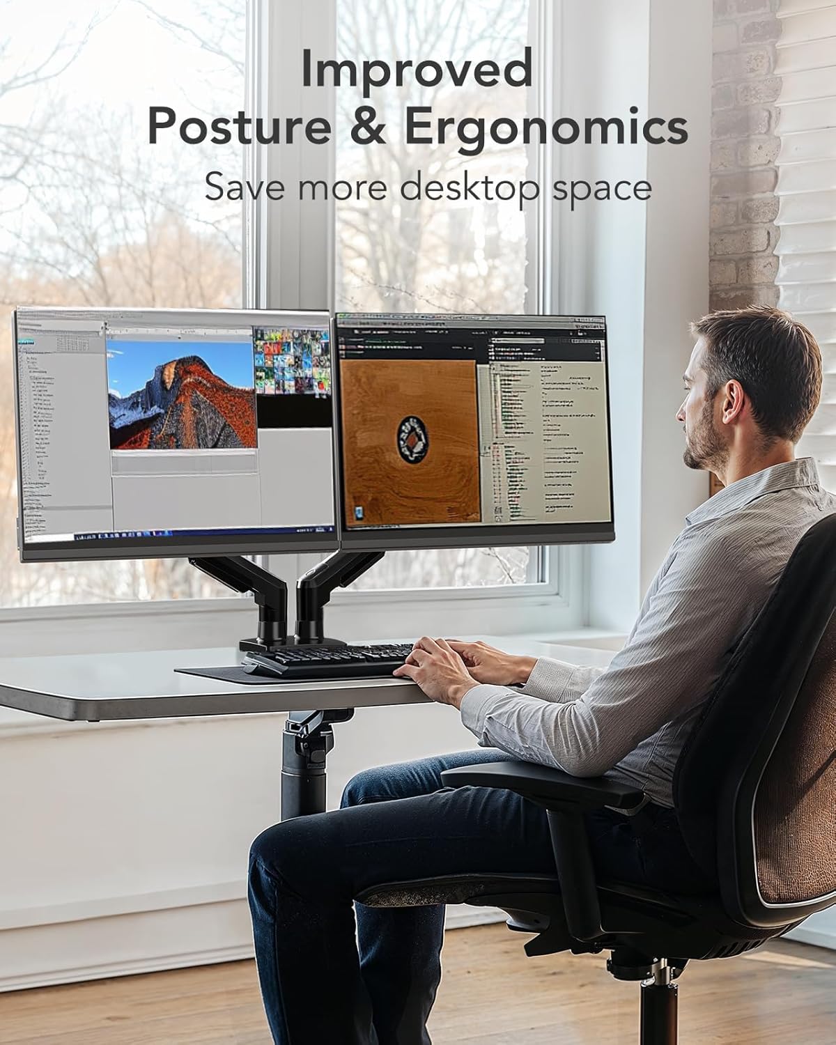 Maximize Desk Space – The dual-arm monitor stand lifts your screens, freeing up over 50% of your desk, and features cable management to keep wires organized and reduce clutter.