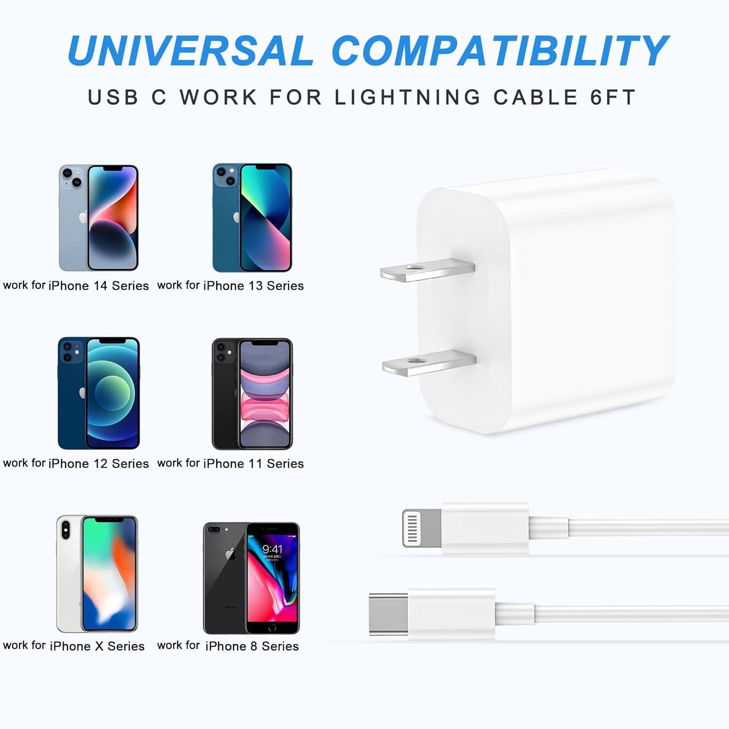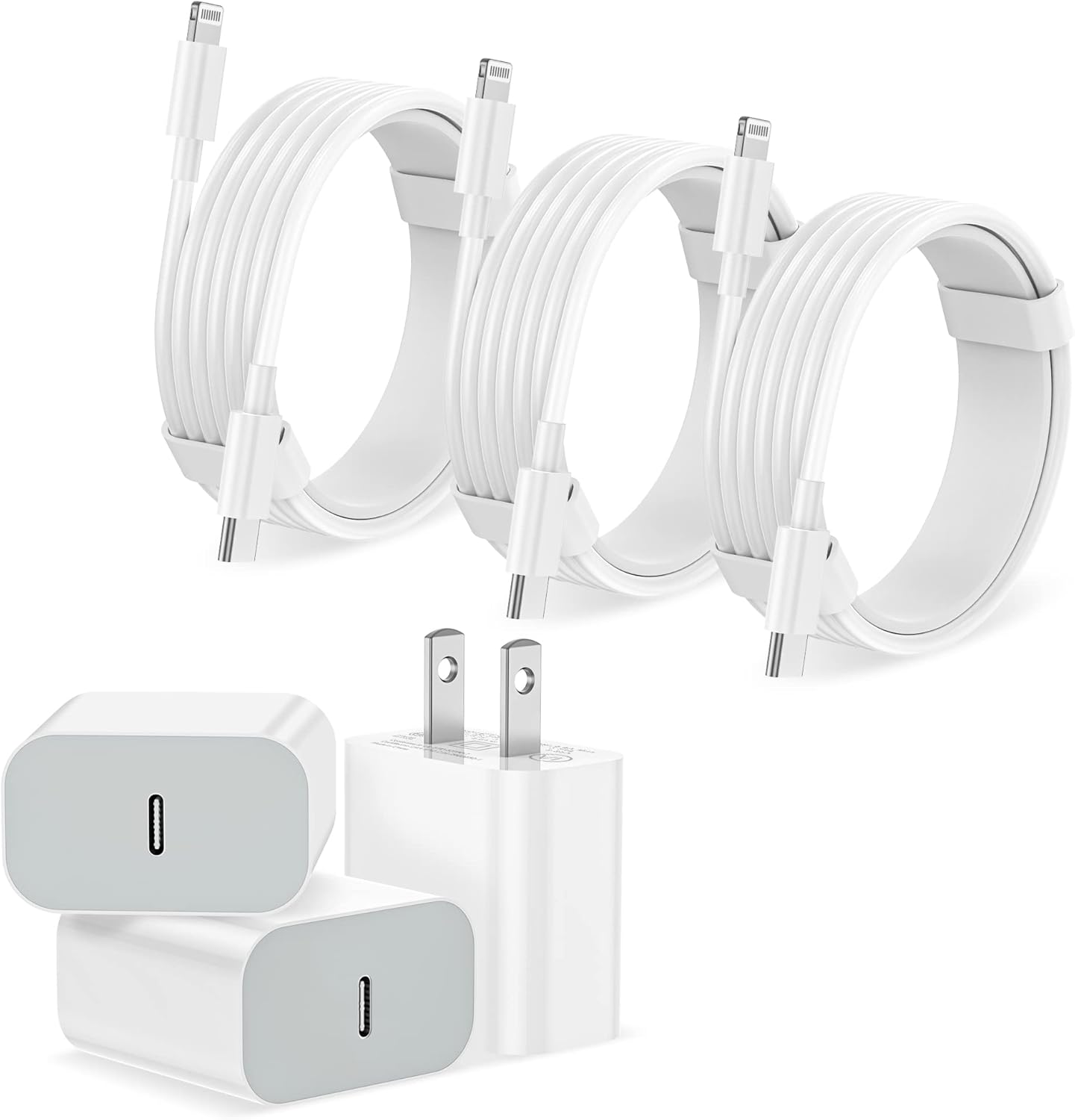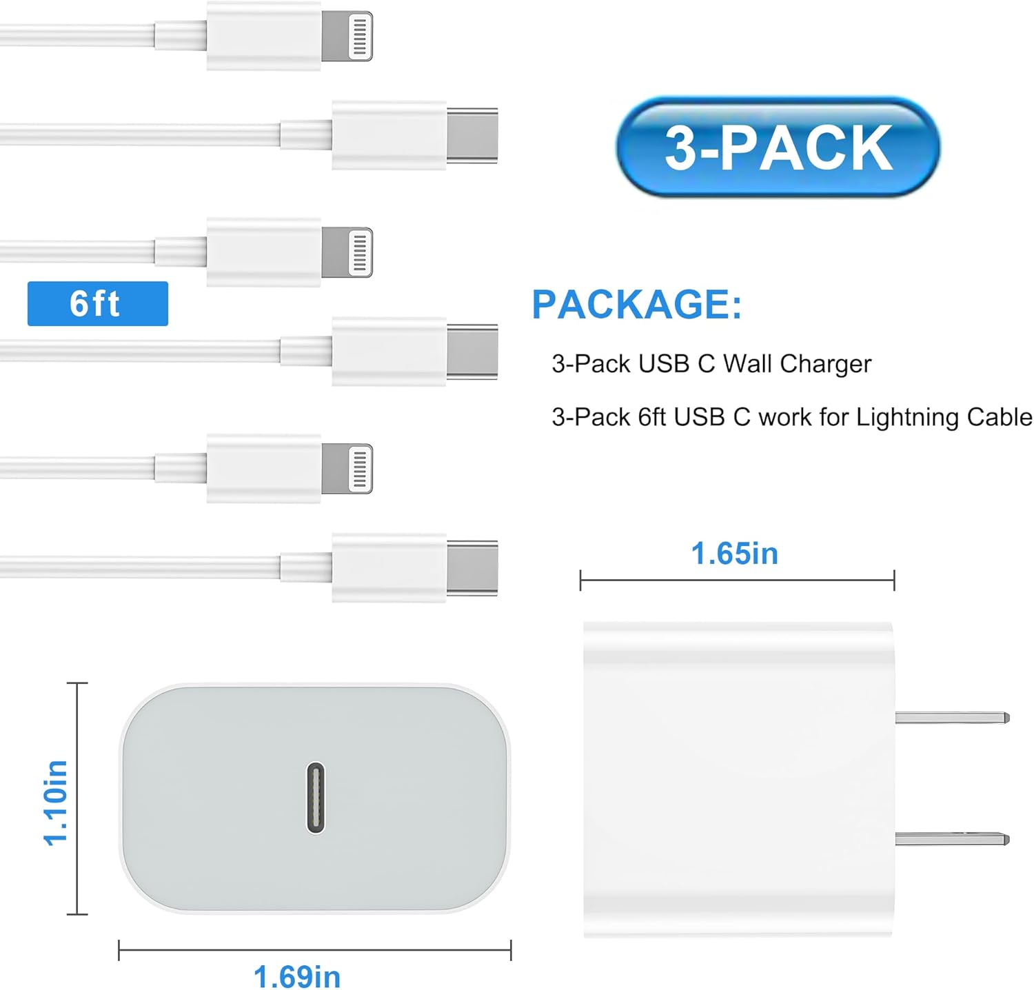 【What You Get】3 pack USB-C charger block and 3 pack 6ft USB-C to lightning charging cord. If you have any questions, we will resolve your issue at first time.