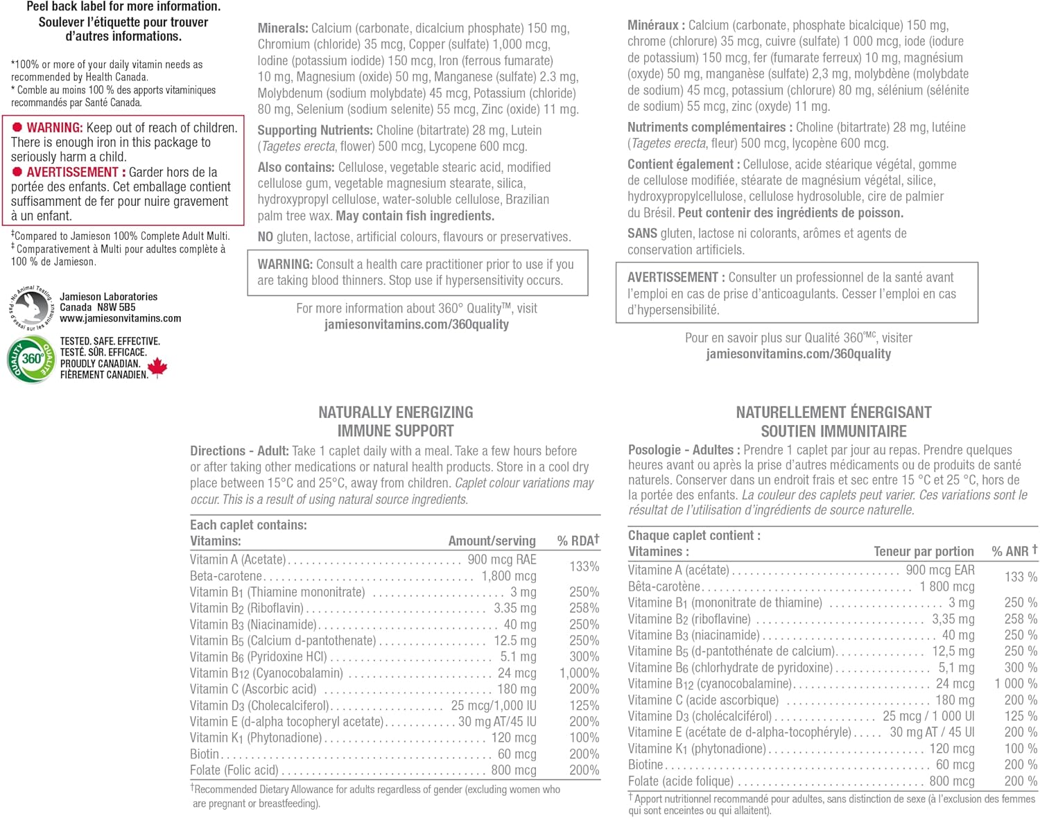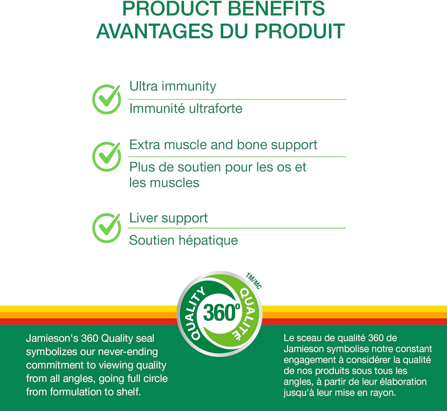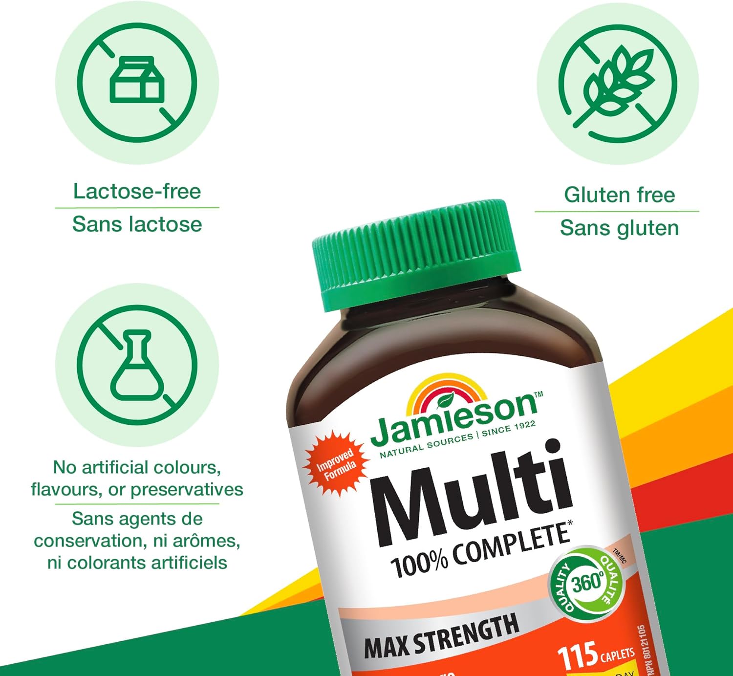 Jamieson 100% Complete Max Strength Multivitamin for Adults is the easy way to get 100% of your body’s daily vitamin needs. It is formulated so you can feel confident you are getting 100% or more of the vitamins your body needs each day! With more B, C and D compared to Jamieson 100% complete Adult Multi.