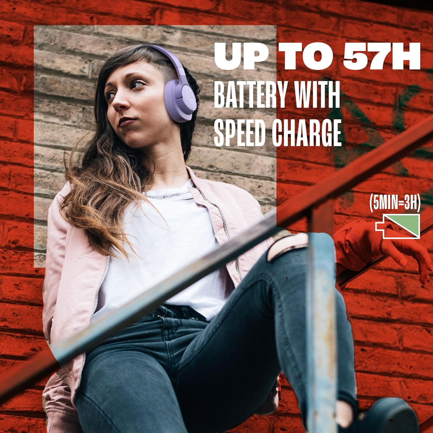 The JBL Tune 720BT headphones stream powerful JBL Pure Bass sound thanks to the latest 5.3 BT technology. Easy to use, these headphones provide up to 76 hours of pure pleasure and an extra 3 hours of battery with just 5 minutes of charge. Download the free JBL Headphones App and customize your sound through the EQ, while Voice Prompts guide you through the headphones features. Manage calls, sound and volume from the earcup, thanks to the convenient button controls. If a call comes in while you are watching a video on another device, the JBL Tune 720BT seamlessly switches to your mobile device, so you never miss a call. lightweight and comfortable even after hours of listening, the JBL Tune 720BT headphones fold flat in your backpack to follow you everywhere.