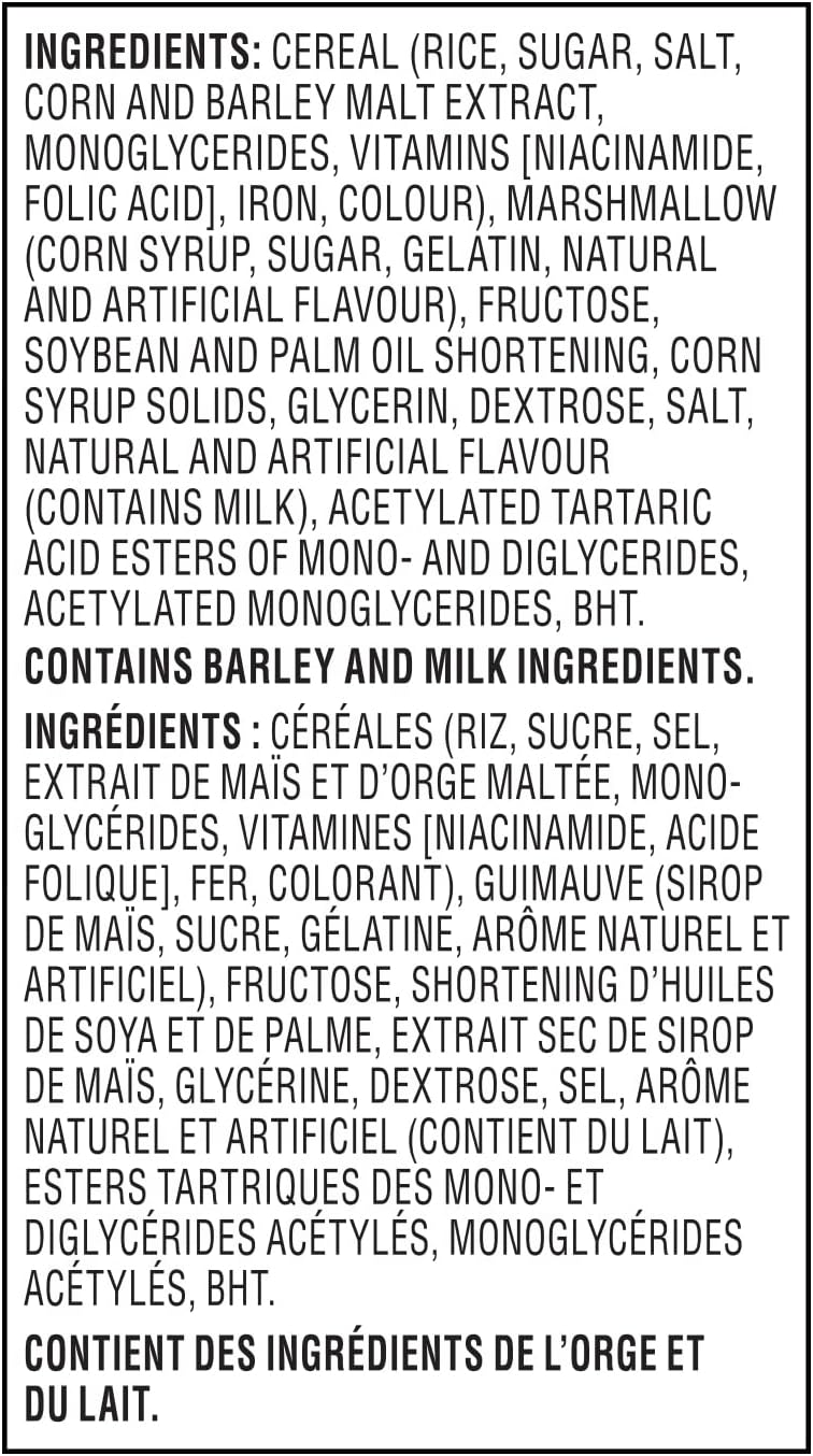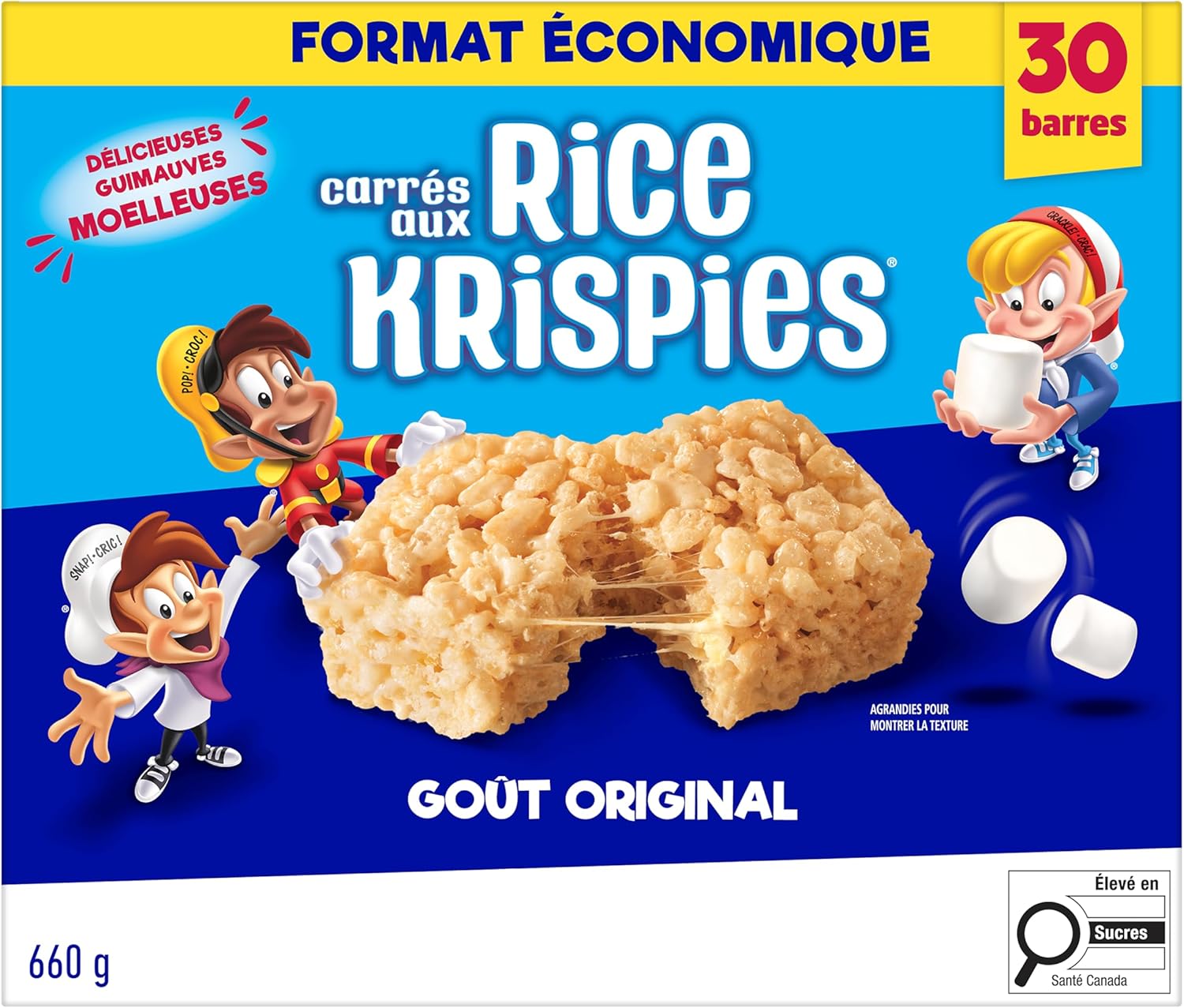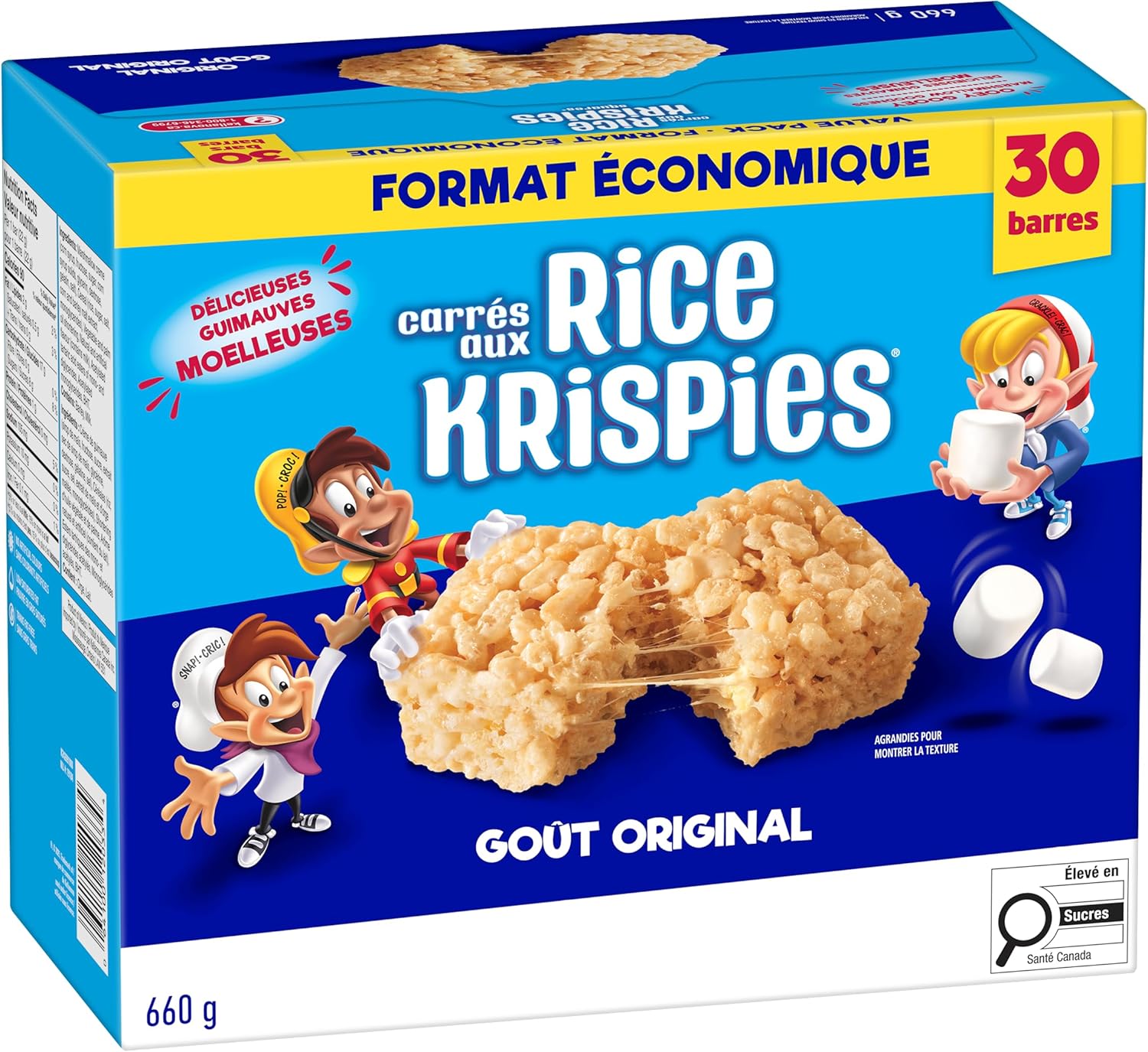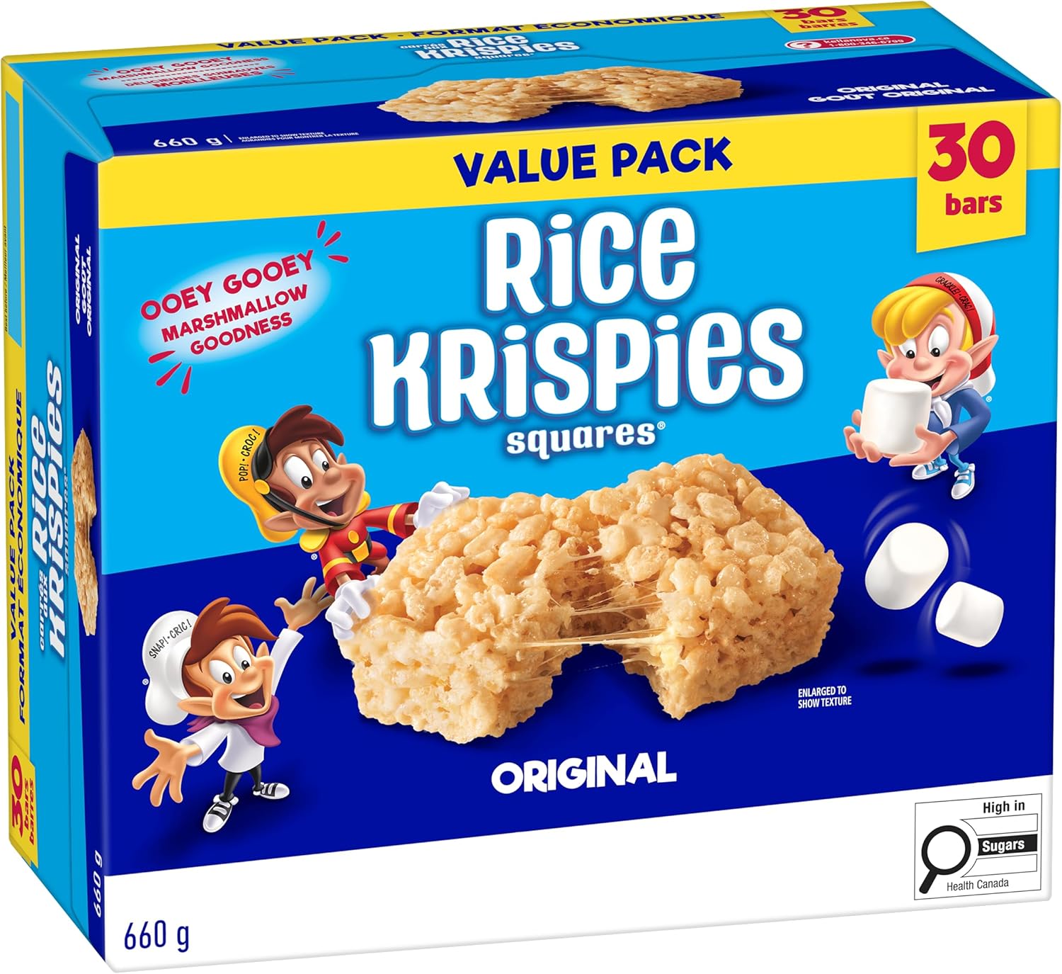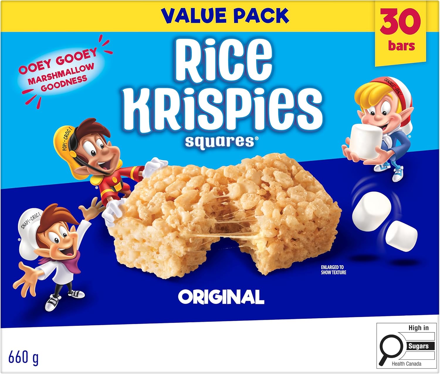 Crispy rice cereal bars with ooey gooey marshmallow, Rice Krispies Squares bars are sure to bring the fun to break time. Each chewy square is individually wrapped, perfect for lunchboxes for a mid-day snack, you can take them on the go for your kids activities, it’s a sweet treat that is fun to eat.