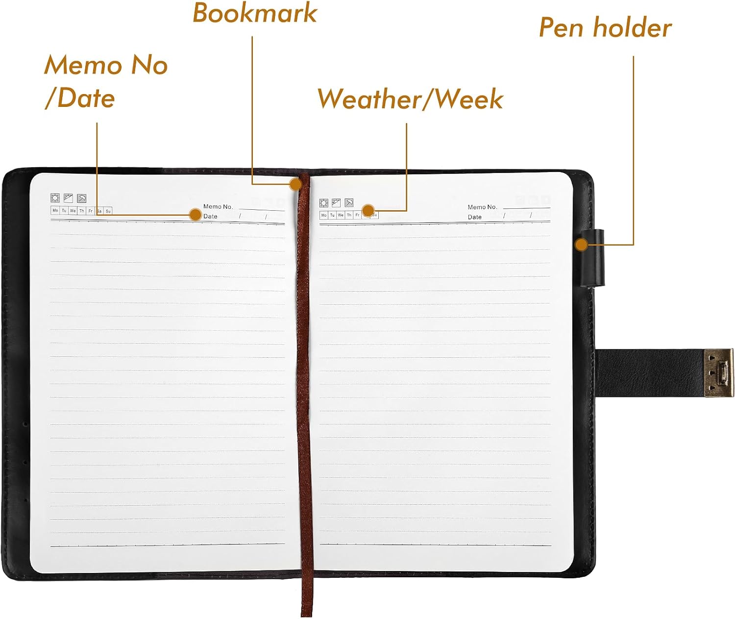 PROFESSIONAL PU LEATHER: Wrapped in premium black faux leather (PU), this hardcover journal offers a vintage and sophisticated look suitable for office meetings or personal use. The durable, water-resistant cover protects the inner pages from wear and spills during daily commutes.