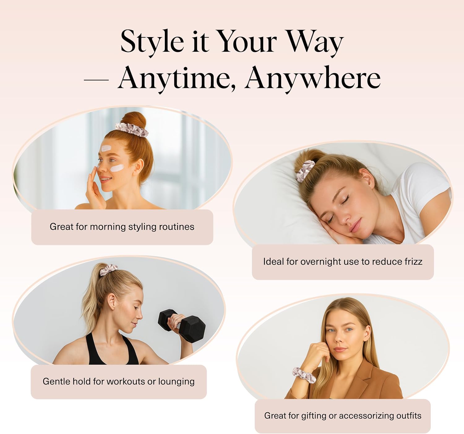 WAKE UP FRIZZ-FREE: Satin scrunchies help you wake up to smoother, healthier-looking hair by minimizing breakage and eliminating creases while you sleep. Their satin construction is softer than silk scrunchies, allowing your strands to rest without damage. Use them as overnight ponytail holders or as daytime hair elastics that provide all-day comfort and style. A perfect blend of care and convenience for women who want effortless, frizz-free hair.