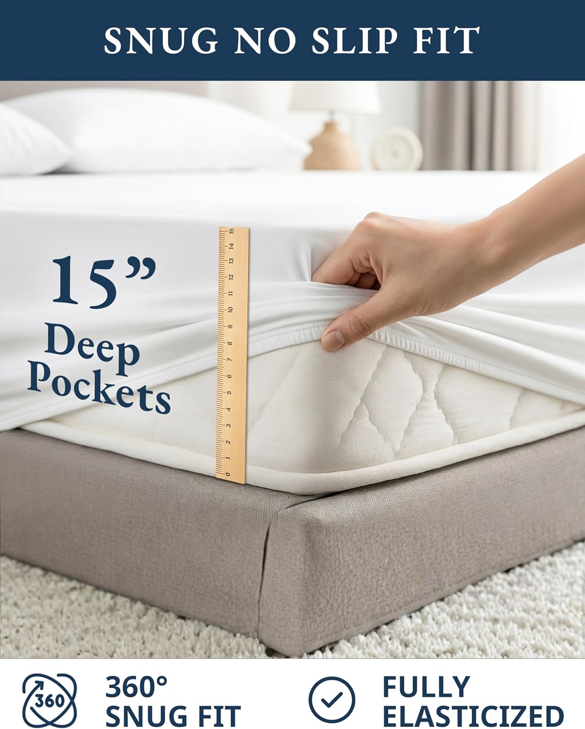 Deep Pocket Fitted Sheet – A Flawless Fit That Lasts: Designed with secure 15-inch deep pockets, the fitted sheet hugs mattresses tightly — even pillow-top and memory foam styles — for a smooth, tucked-in look. Made from long-staple organic cotton and mercerized for strength, it resists shrinking, pilling, and fading through every wash.