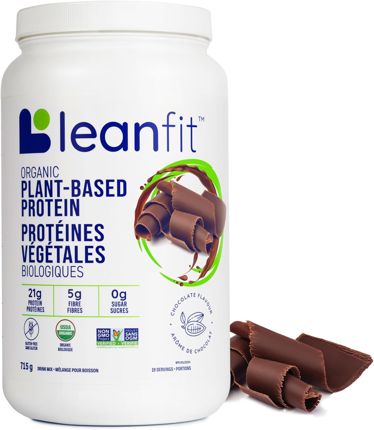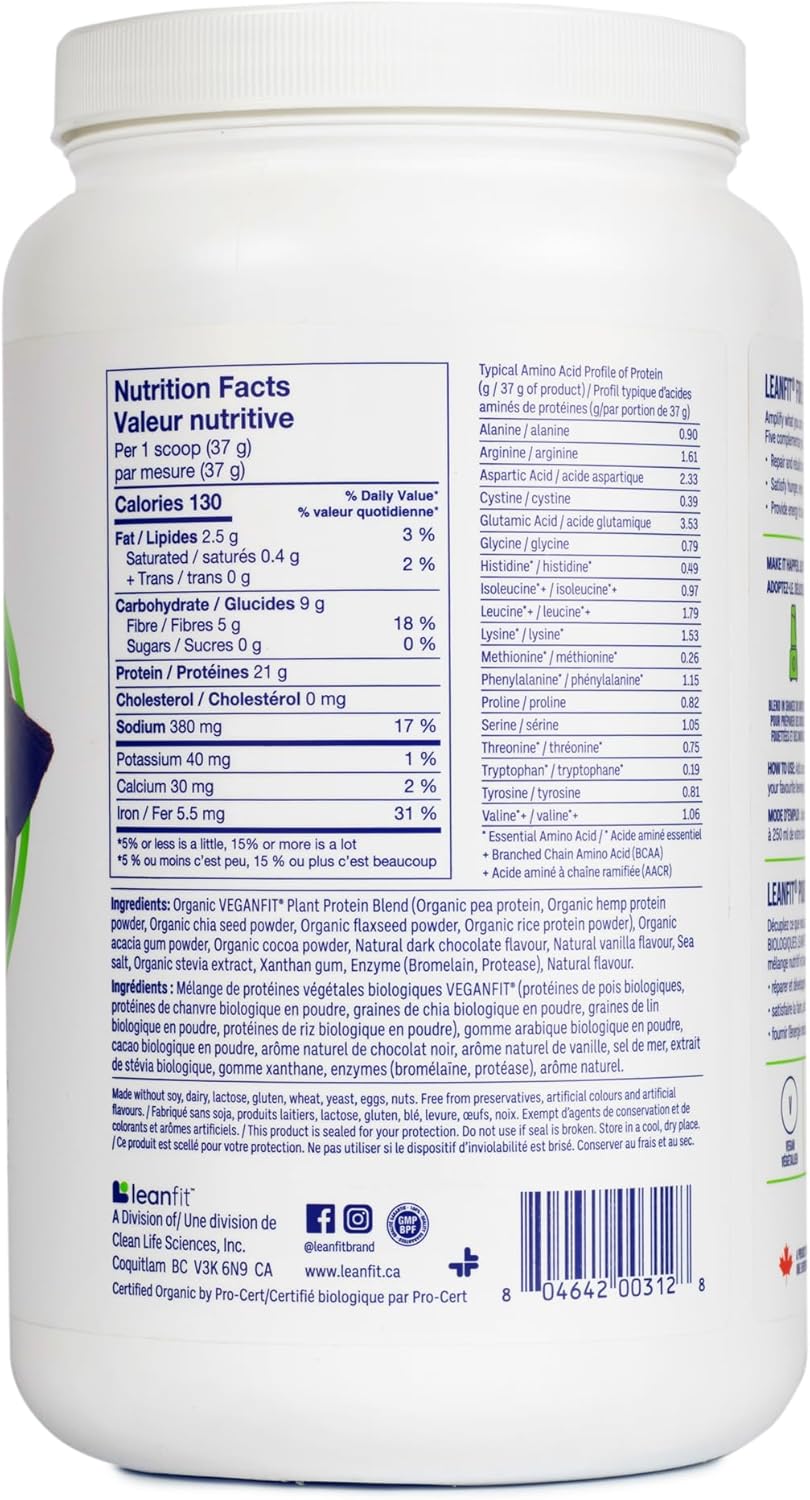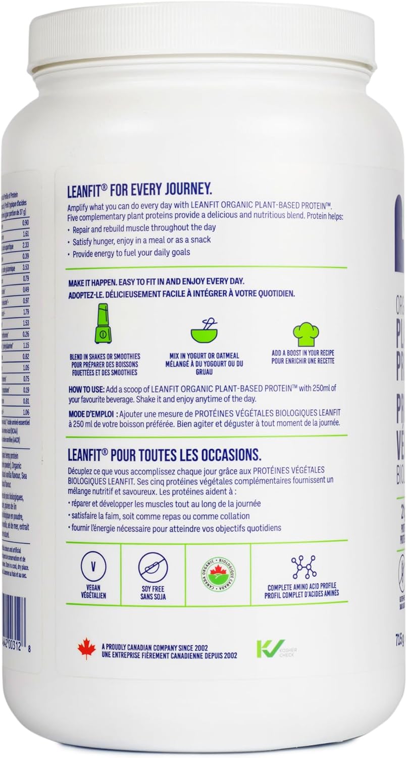 Amplify what you can do every day with our delicious and nutritious LEANFIT ORGANIC PLANT-BASED PROTEIN that’s smooth and easy to mix. Made with a blend of five organic plant proteins including organic pea, organic rice powder, organic chia seed powder, organic flax seed powder, and organic hemp protein powder, it mixes well to create an easy-to-digest complete protein. We use Canadian-grown hemp protein that is manufactured in our very own facility in Alberta! Each scoop contains 21g of vegan protein, 5g fibre, 5.5mg iron (31% of your daily iron requirements), 0g sugar, and 3.8g of BCAAs which is part of a complete amino acid profile to repair and rebuild muscle, decrease muscle soreness and exercise fatigue, and provide energy. This organic vegan protein powder is free of colours and flavours, preservatives, soy, dairy, gluten, and more. It is made with natural chocolate flavouring and is also available in an irresistible natural vanilla flavour. If you prefer unflavoured, try our unsweetened option! LEANFIT ORGANIC PLANT-BASED PROTEIN is suitable for vegans and is a convenient, nutritious, and tasty way to satisfy hunger and fuel your daily goals. Add a scoop to 250ml of water or your favourite beverage to make a shake, blend it in a smoothie with non-dairy milk, or mix it in with your recipe or morning pancakes for an extra boost of protein – it’s your choice! At LEANFIT, we believe that every journey is unique, and everybody gets there differently. With small, steady wins, everyone can get the lift or personal momentum to keep going. Make it happen and make better choices easier with LEANFIT’s amazing taste and nutrition.