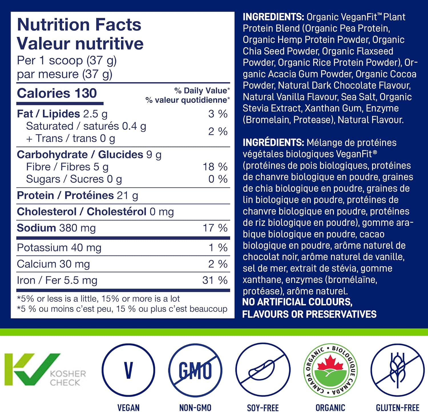 ORGANIC PLANT-BASED CHOCOLATE PROTEIN POWDER: Each serving contains 21g protein, 5g fibre, 6mg iron, 130 calories, and 0g sugar.