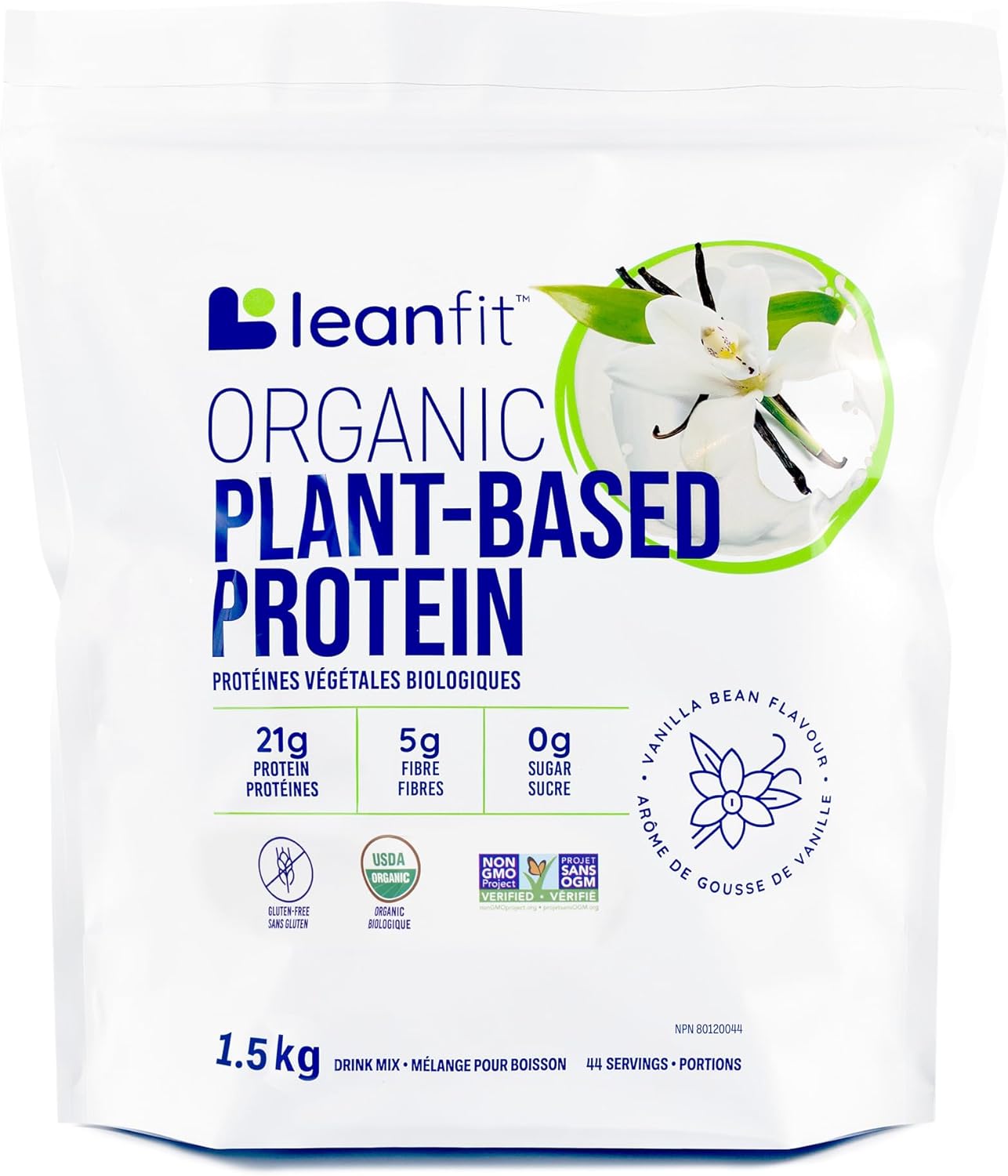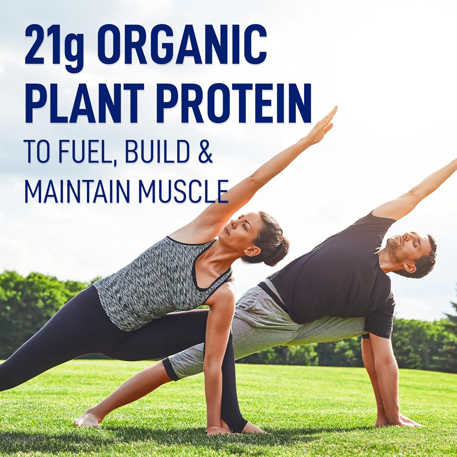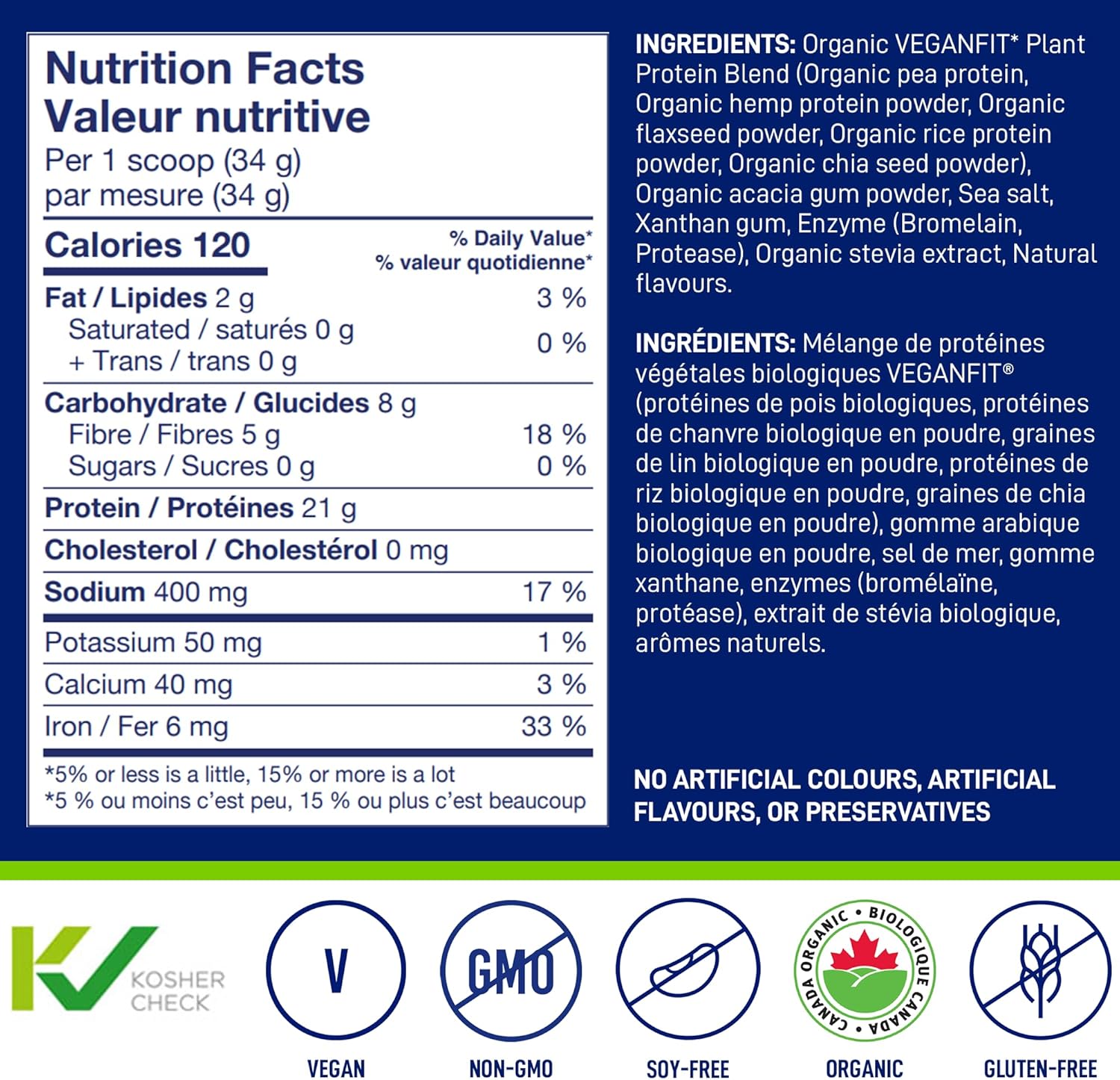 ORGANIC PLANT-BASED VANILLA PROTEIN POWDER: Each serving contains 21g protein, 5g fibre, 33% of daily iron requirements, 120 calories, and 0g sugar.