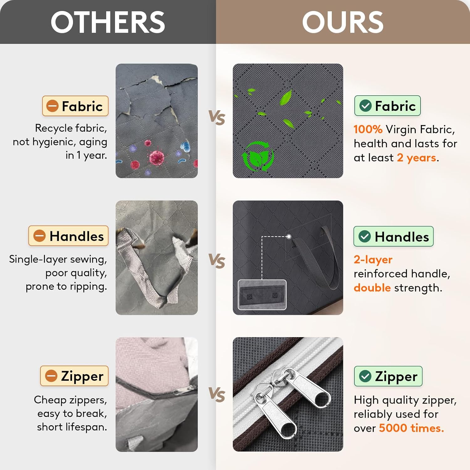 Premium Fabric: The storage bag is made of high quality, odorless, breathable, non-woven fabric that is soft and strong at the same time. ๐“๐ก๐ž๐ซ๐ž ๐ข๐ฌ ๐ง๐จ ๐œ๐š๐ซ๐๐›๐จ๐š๐ซ๐ ๐ฌ๐ฎ๐ฉ๐ฉ๐จ๐ซ๐ญ ๐š๐ซ๐จ๐ฎ๐ง๐ ๐š๐ง๐ ๐š๐ญ ๐ญ๐ก๐ž ๐›๐จ๐ญ๐ญ๐จ๐ฆ ๐จ๐Ÿ ๐ญ๐ก๐ž ๐ฌ๐ญ๐จ๐ซ๐š๐ ๐ž ๐›๐š๐ , which is conveniently designed to fold bags into drawers for saving space.