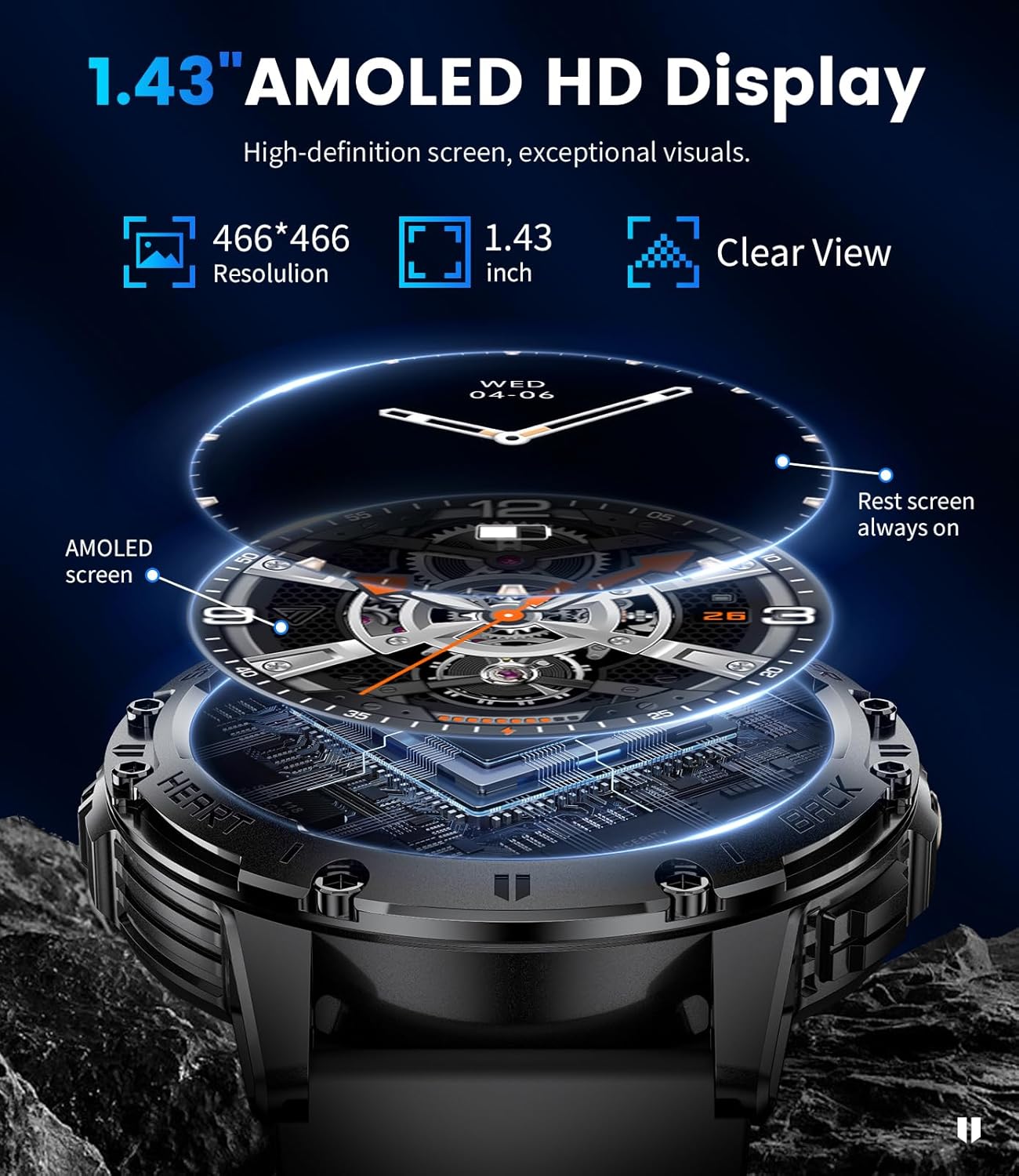 【Experience Convenience on Your Wrist 】Enjoy AI voice and Bluetooth calling along with message push,comprehensive health tracking, calorie tracker, sedentary reminder, water reminder, alarm clock, weather display and multi-language support.The “Always-On Display” feature allows you to check the time without raising your wrist or touching the screen. (Note: Activating this feature increases battery consumption.)