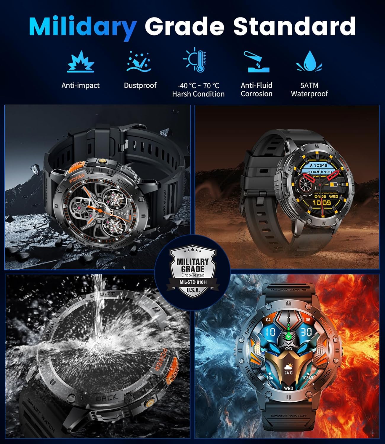 【Military-Grade Durability】 The smart watch is designed for men who demand exceptional reliability and performance in extreme conditions. It undergoes rigorous testing to meet military standards, offering excellent shock resistance and waterproof capabilities. With a stainless steel bezel and PC-ABS alloy back, this watch protects against extreme temperatures and harsh environments. Whether you’re on an adventurous expedition or facing daily challenges, this smartwatch is your ideal companion.