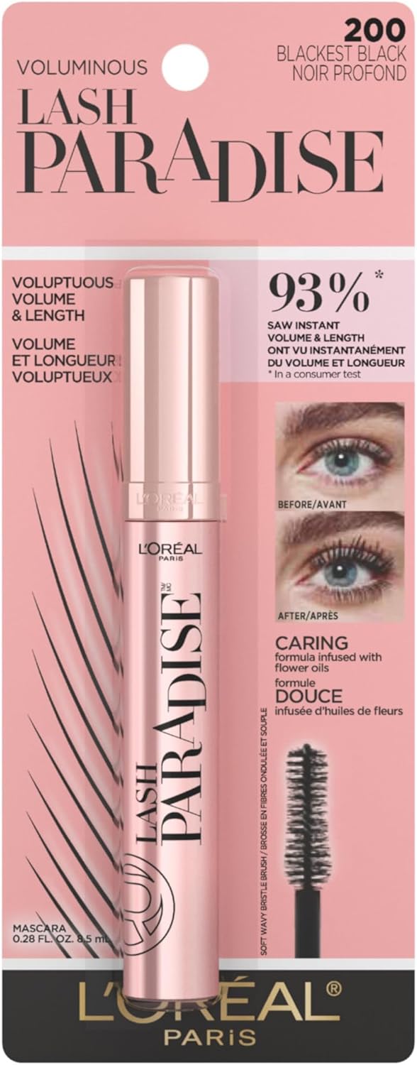 What’s in the box: L’Oréal Paris Voluminous Lash Paradise Mascara, Volume & Length for Up to 24 Hours with Flower Oil Infused Conditioning Formula for Sensitive Eyes, Color: Blackest Black, 0.28 fl. oz.