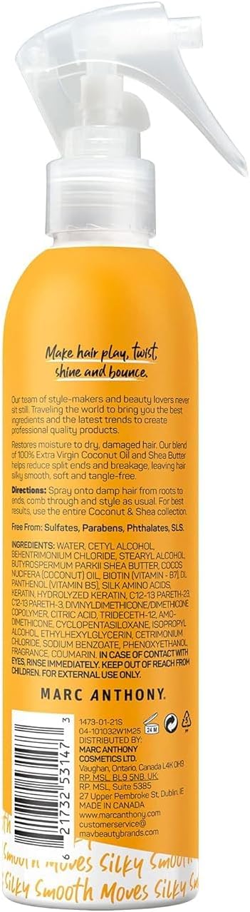 LEAVE IN CONDITIONER: This detangling mist is enriched with Coconut Oil & Shea Butter, to restore moisture to dry, damaged hair & to help reduce split ends & breakage. Works on all hair types.