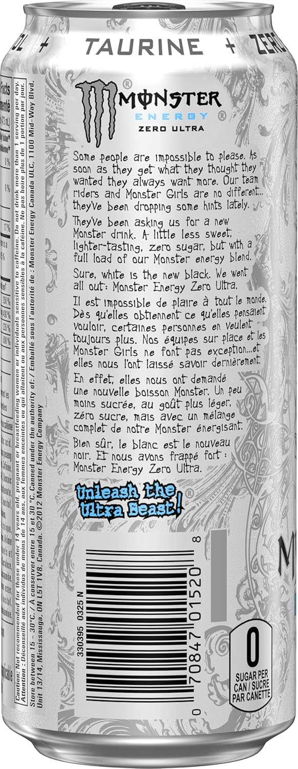 Some people are impossible to please. As soon as they get what they thought they wanted they always want more. Our team riders and Monster Girls are no different. they’ve been dropping some hints lately. They’ve been asking us for a new Monster drink. A little less sweet, lighter-tasting, zero calories, but with a full load of our Monster energy blend. Sure, white is the new black. We went all out: Monster Energy Zero Ultra. Unleash the Ultra Beast!
