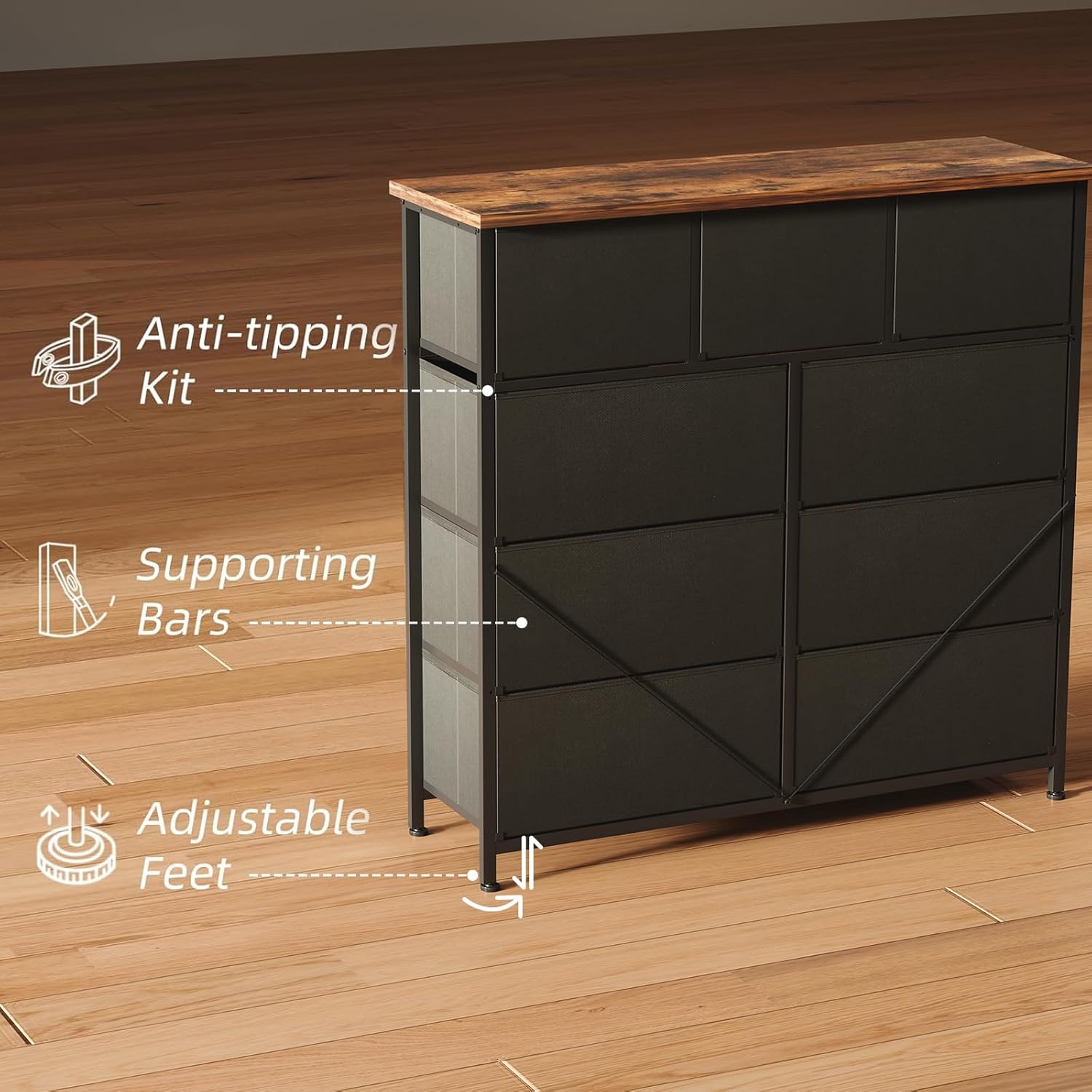 [Stable Construction]: The tall 4-Tier drawers are made of sturdy metal frame and durable wooden waterproof tabletop. The 9 removable drawers with easy-to-pull wooden handles. The strong steel frame enhances product stability and load capacity. 4 adjustable feet protect the floor from scratches and fit for uneven floors.