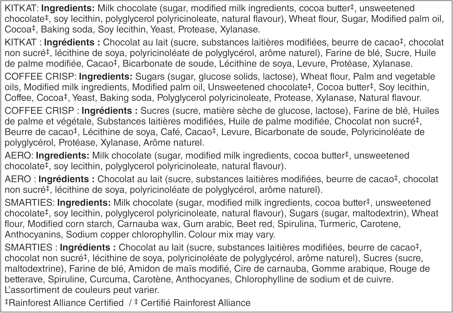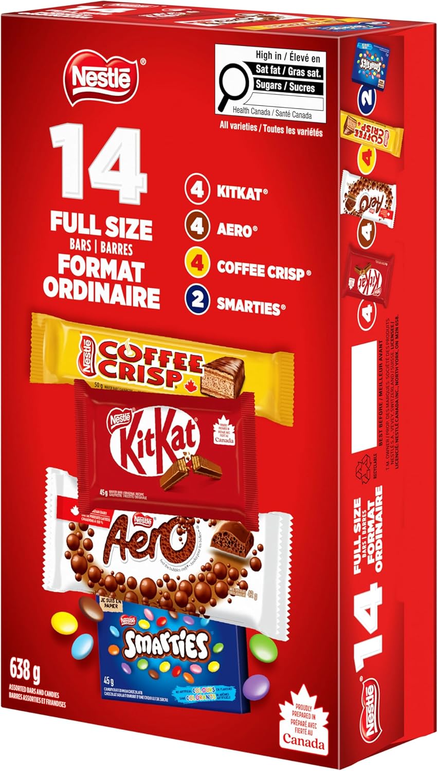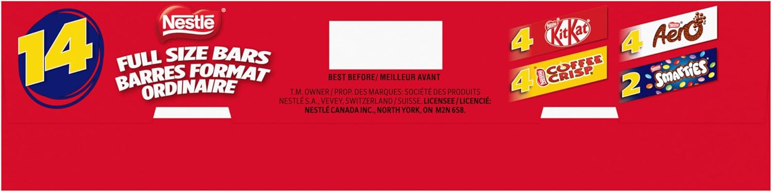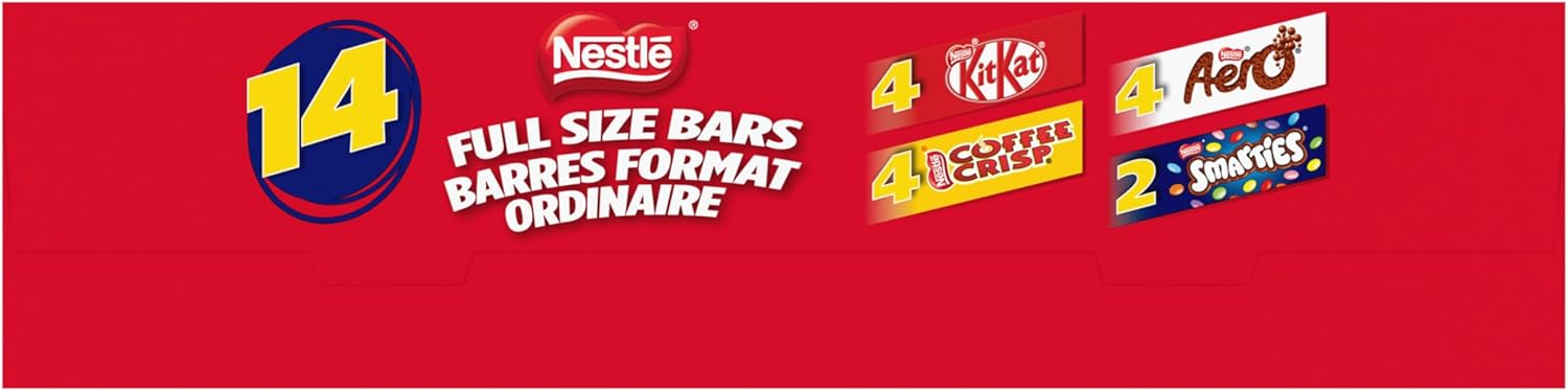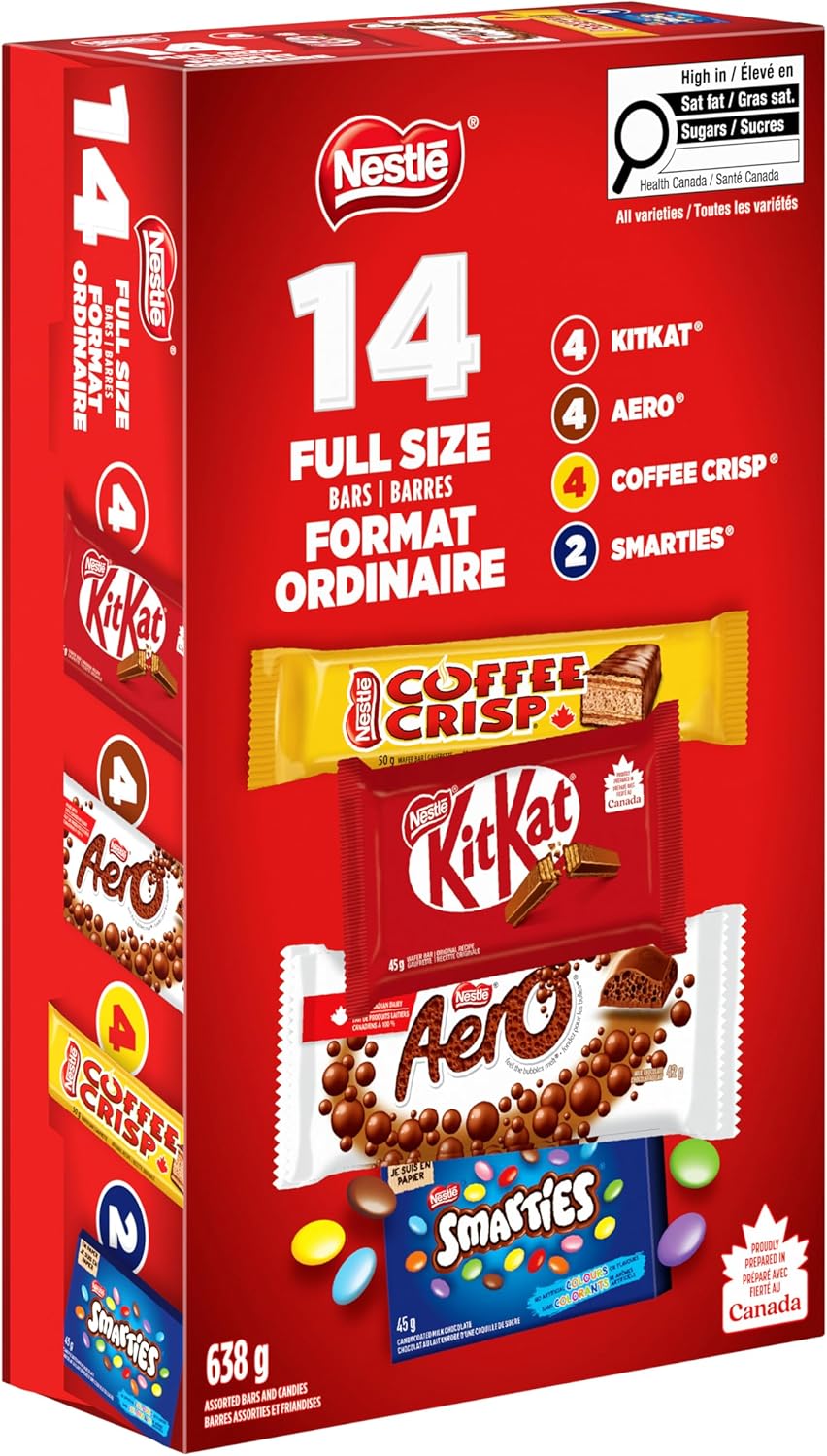 All your NESTLÉ favourites are together in this package of full size bars and candies. Savour KITKAT’s iconic crisp wafer, AERO’s melt-in-your-mouth milk chocolate bubbles, COFFEE CRISP’s blend of crispy wafers and coffee crème with a light chocolatey coating, or SMARTIES’ colourful candy-coated milk chocolate. Proudly prepared in Canada, each box contains 14 individually wrapped treats — 4 KITKATs, 4 AERO chocolate bars, 4 COFFEE CRISPs, and 2 boxes of SMARTIES — perfect for sharing with family and friends. In collaboration with the Rainforest Alliance, the NESTLÉ Cocoa Plan is helping cocoa farmers enhance farming practices. Additionally, for more than 34 years, NESTLÉ Canada has raised millions for Kids Help Phone, Canada’s only 24/7, free, confidential, and multilingual e-mental health service.