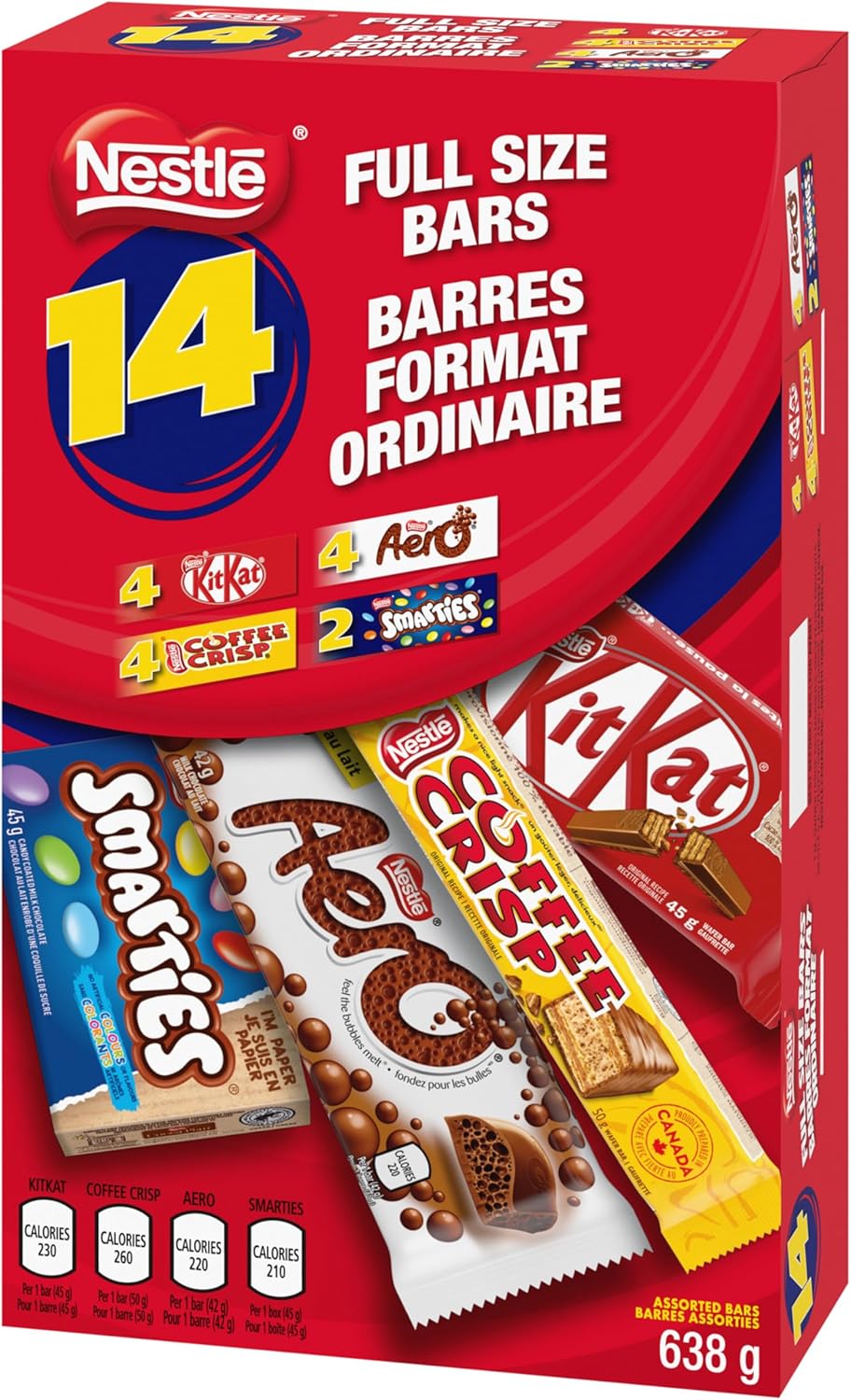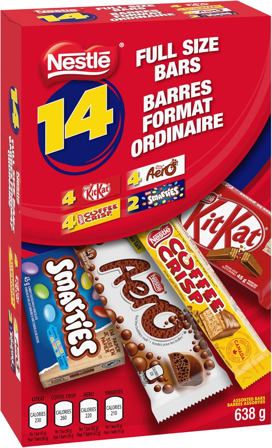 All Your Full Size Favourites In One Pack: Contains 4 KITKATs, 4 AERO chocolate bars, 4 COFFEE CRISP bars, and 2 boxes of SMARTIES