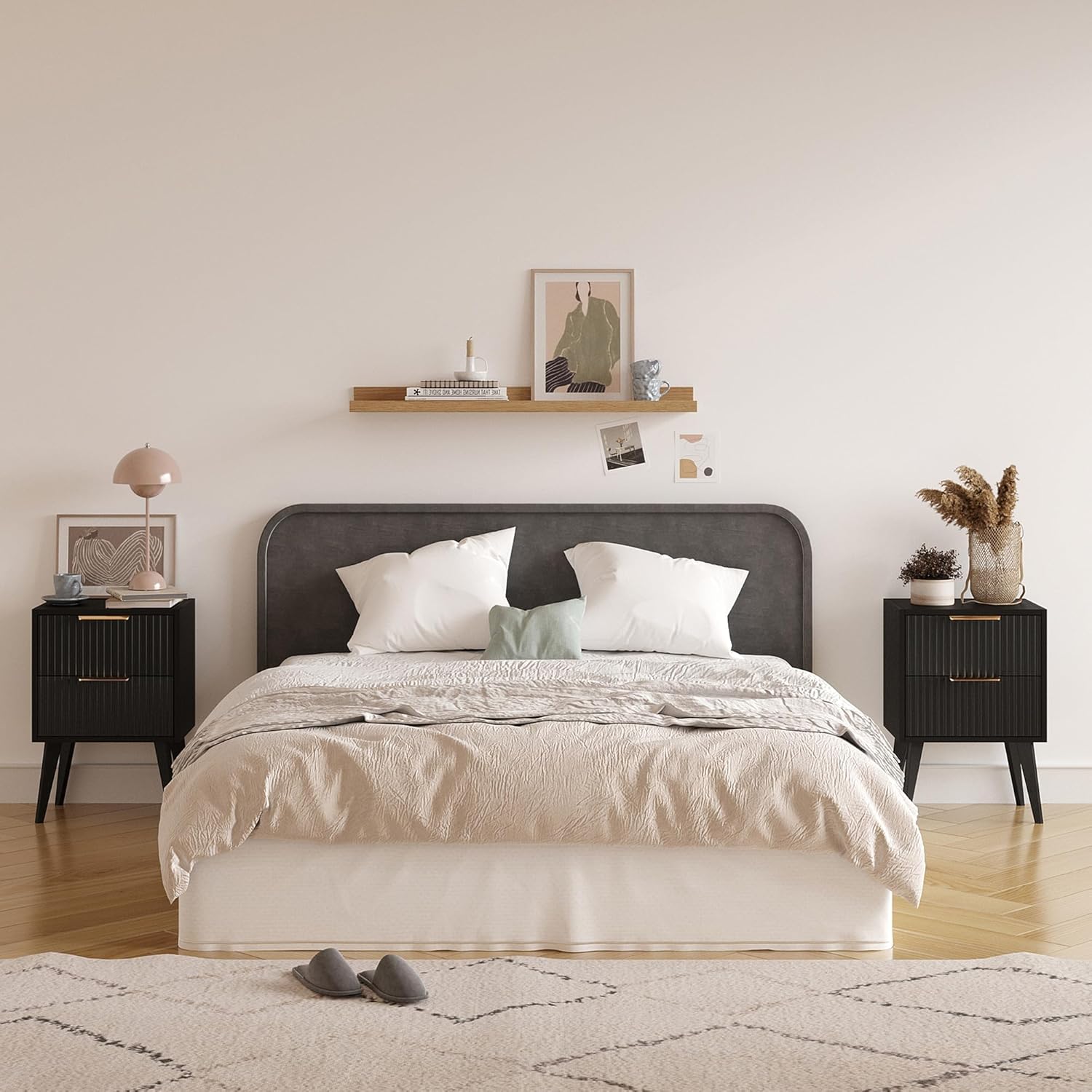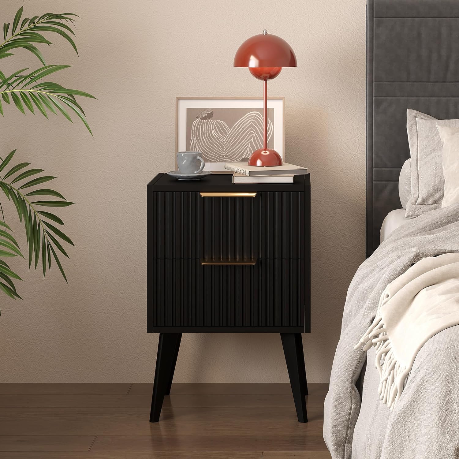 Fluted Modern Design: This nightstand have distinctive waveform fluted panel ,which adding a modern and visually appealing touch to your bedroom decor.The wide metal handles and wooden legs of the bedside table add a modern touch