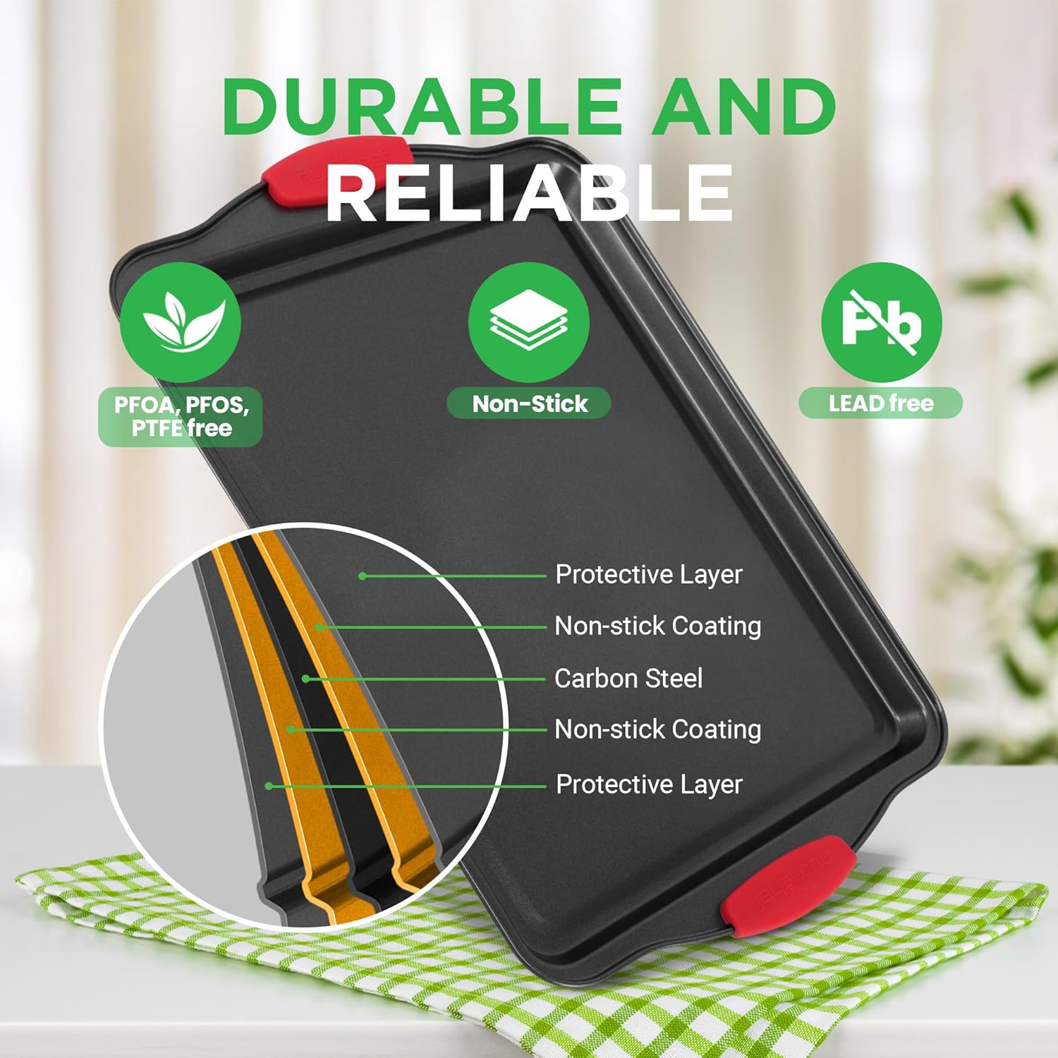 DURABLE BAKEWARE SET: These cookie pans are made from carbon steel & non-stick coating that resists warping to keep your baking, roasting & toasting for years. It is suitable for the oven, refrigerator, and freezer.