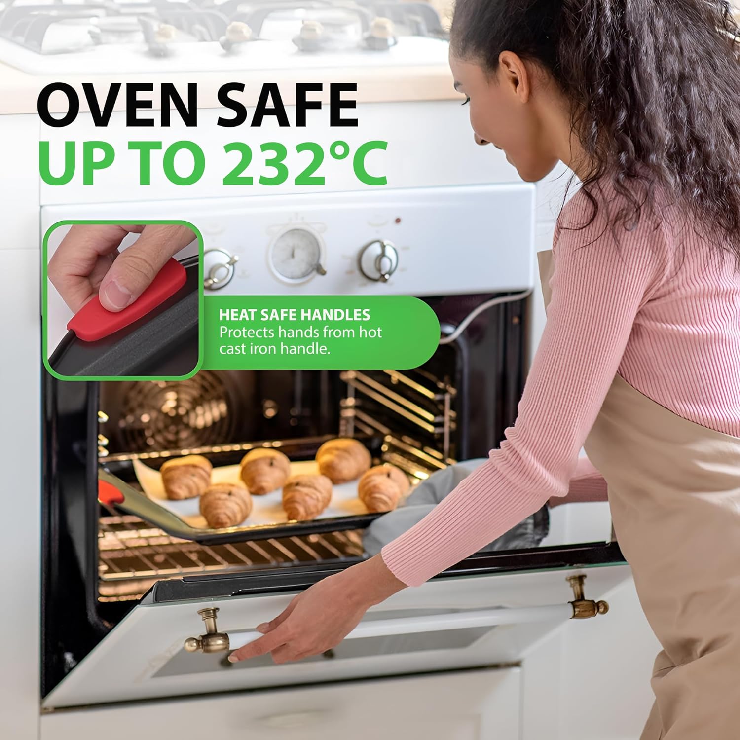 HANDLES THE HEAT: bold-colored, commercial-grade restaurant-quality metal bakeware provide a confident grasp while taking the baking pans out of the oven where they are oven safe to 230 degrees Celsius