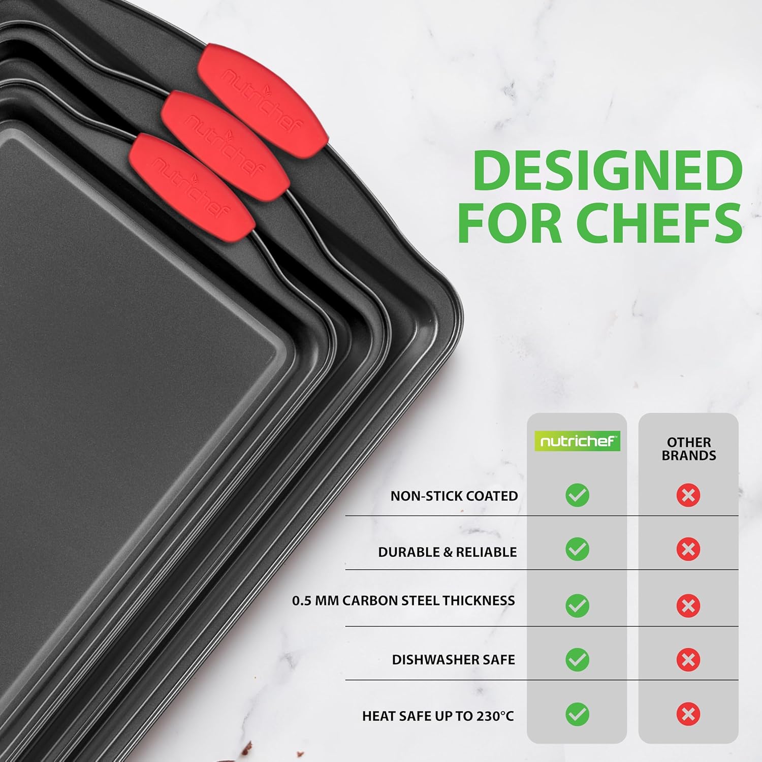 3-PIECE SET: NutriChef 3-piece nonstick cookware set includes Quarter Sheet, Jelly Roll Pan, and Half Sheet Pans. These are a versatile, stylish, and non-stick carbon steel bakeware set with red silicone handles