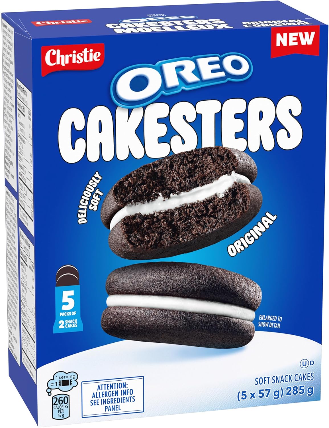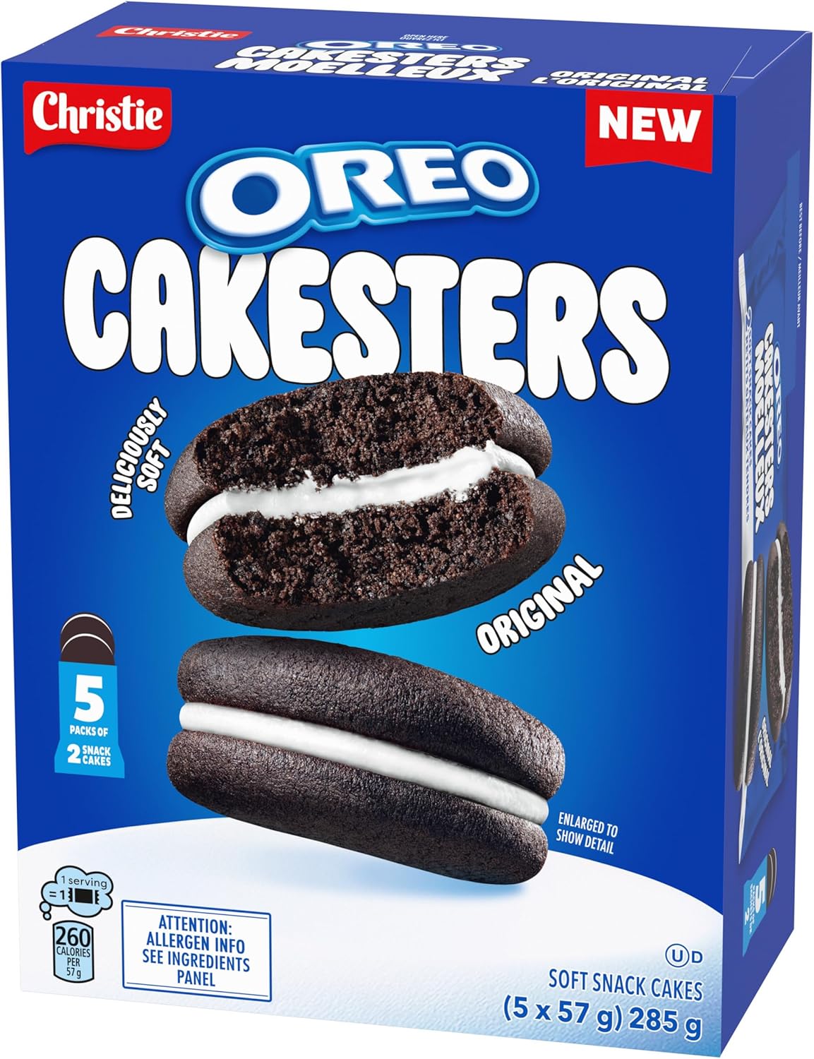 One 285g box with five 57g snack packs of two OREO Cakesters Soft Snack Cakes
