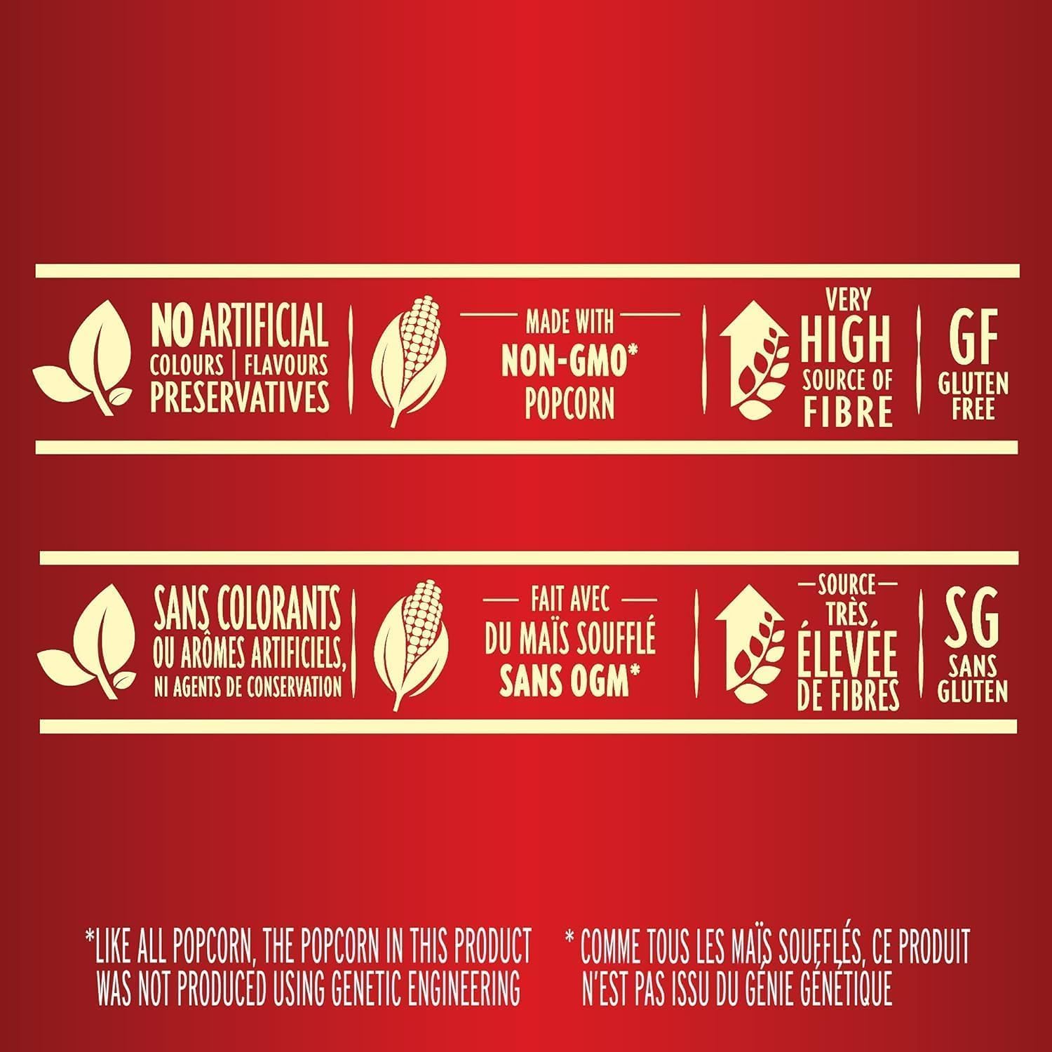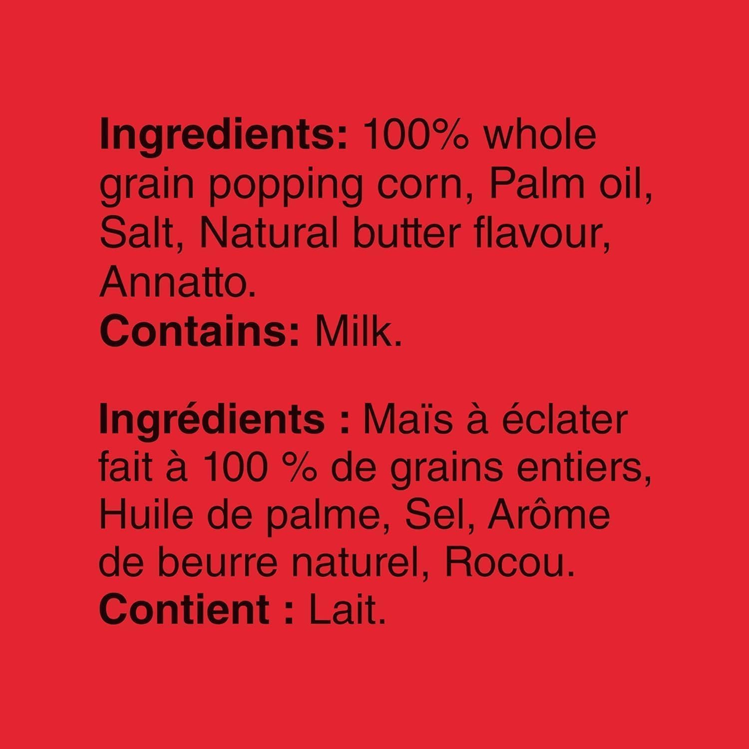 This buttery popcorn is made with 100% whole grain popcorn and contains no artificial colours, flavours, or preservatives
