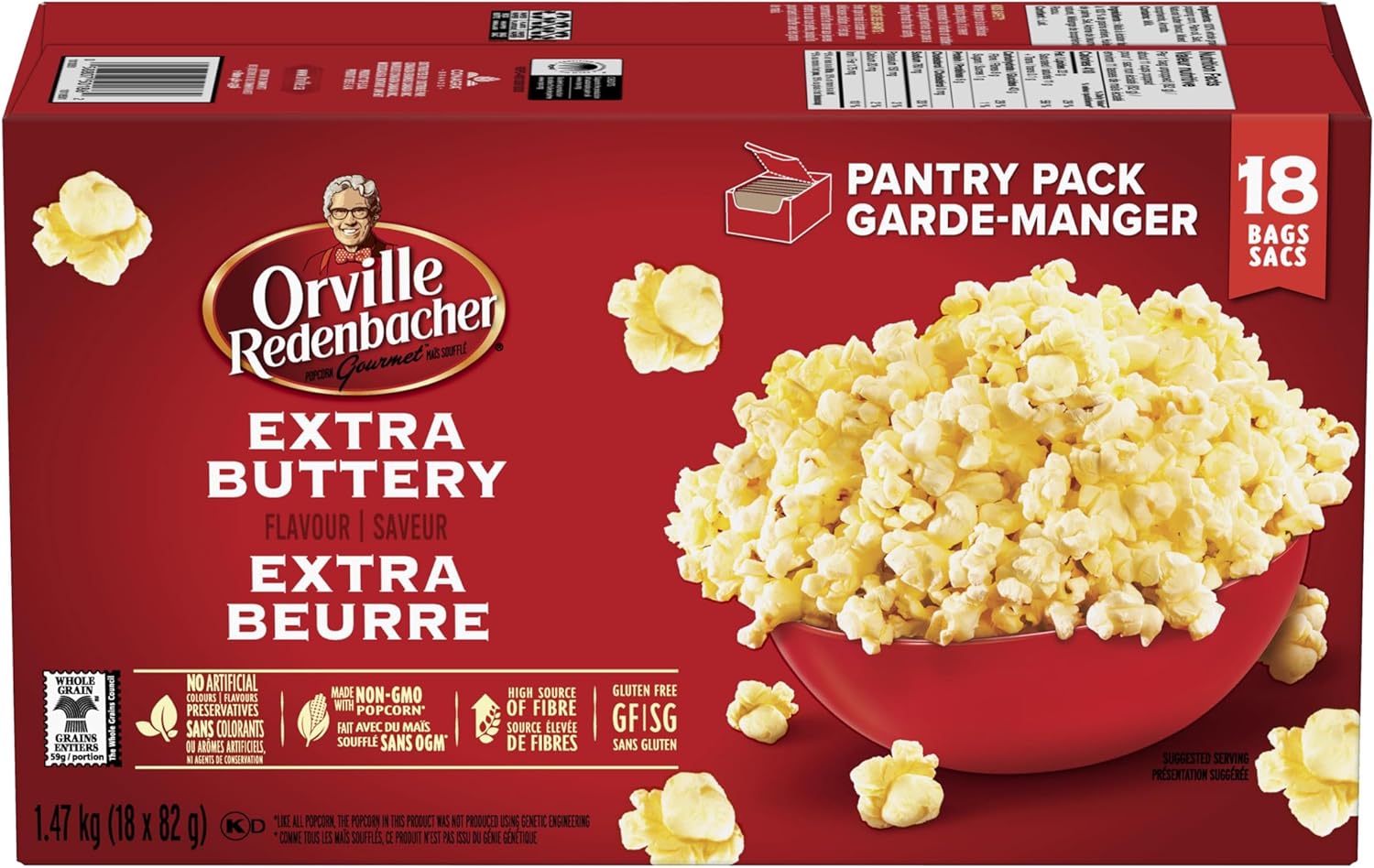 Includes 18 x 82 gram bags of Orville Redenbacher Extra Buttery Microwave Popcorn