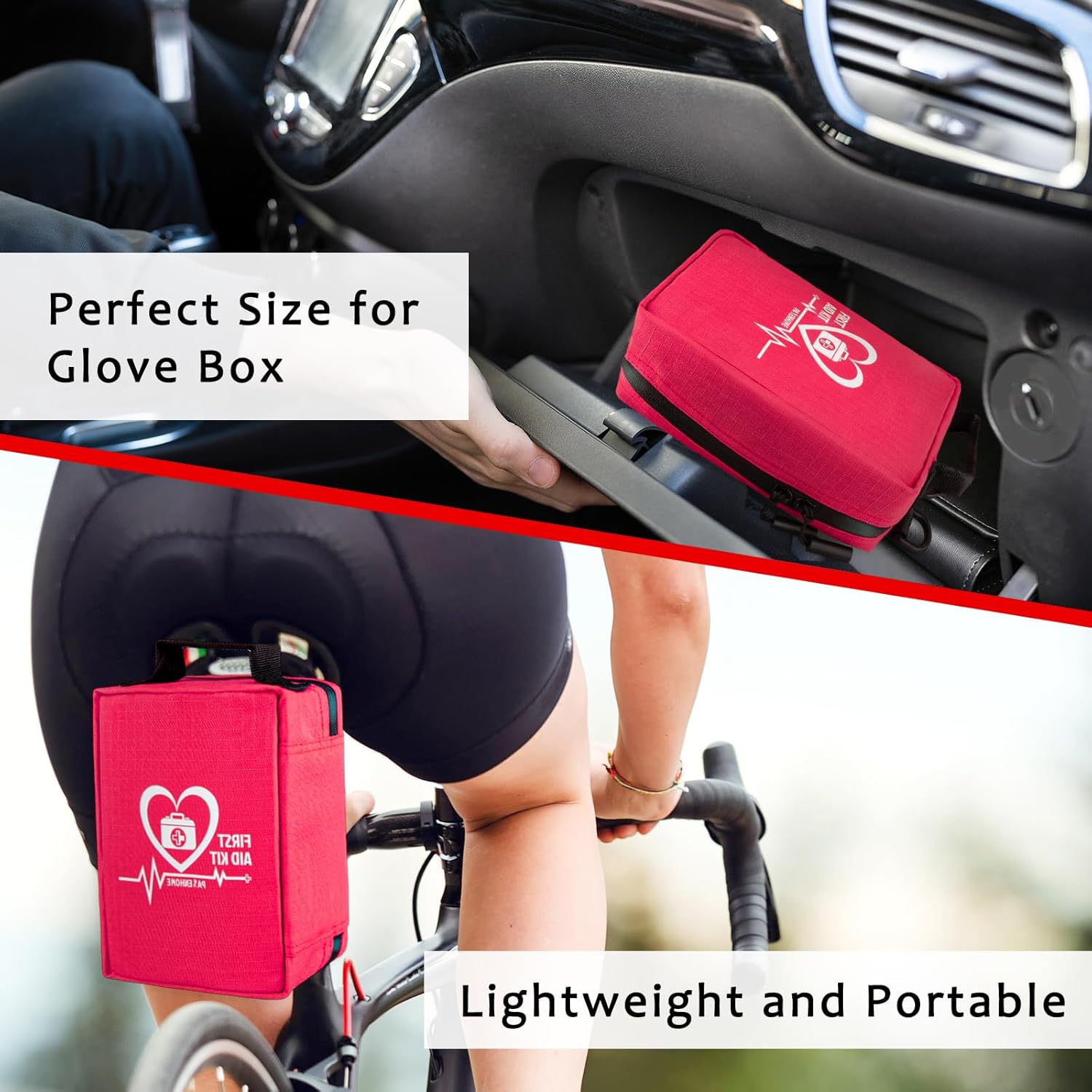 【Streamlined Design with Expandable Capacity】 With a compact size of 7.9” x 5.9” x 3.6” and a mere weight of 1.3 lbs, our first aid bag is effortlessly portable. It easily fits into home medicine cabinets, cars, college dorm rooms, RVs, or can be securely attached to bikes or motorcycles. The thoughtful design incorporates additional space for personalized items, ensuring versatility