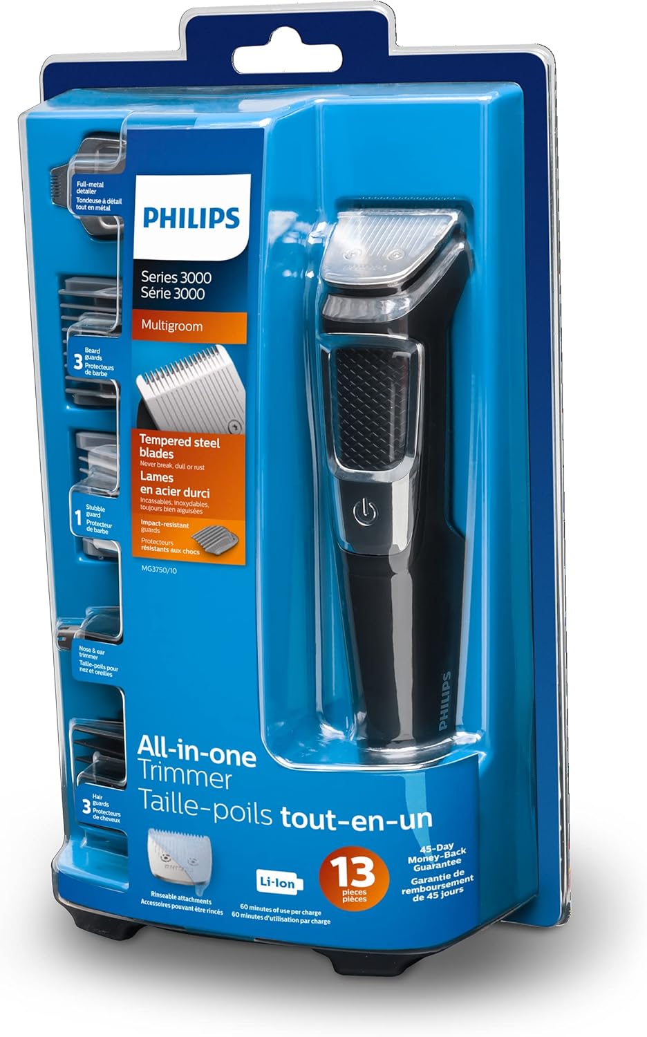 Includes a full-metal trimmer blade, a fullmetal detailer blade, a nose and ear hair trimmer, 3 hair trimming guards, 3 beard trimming guards, a stubble guard, an accessory storage bag, and a cleaning brush.