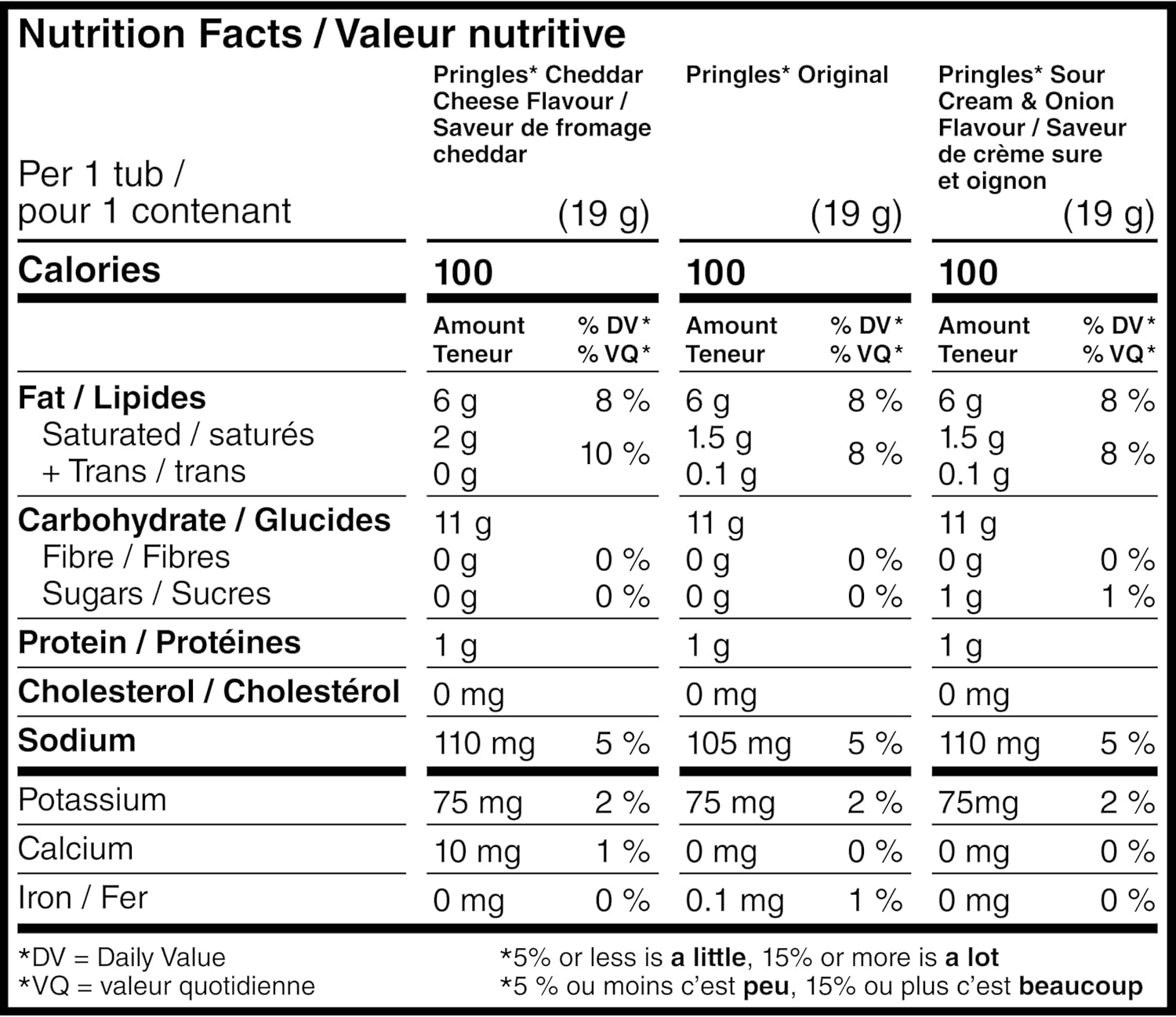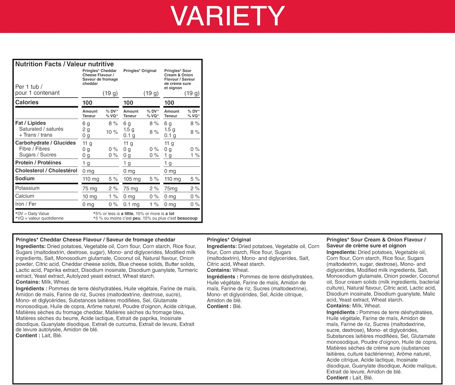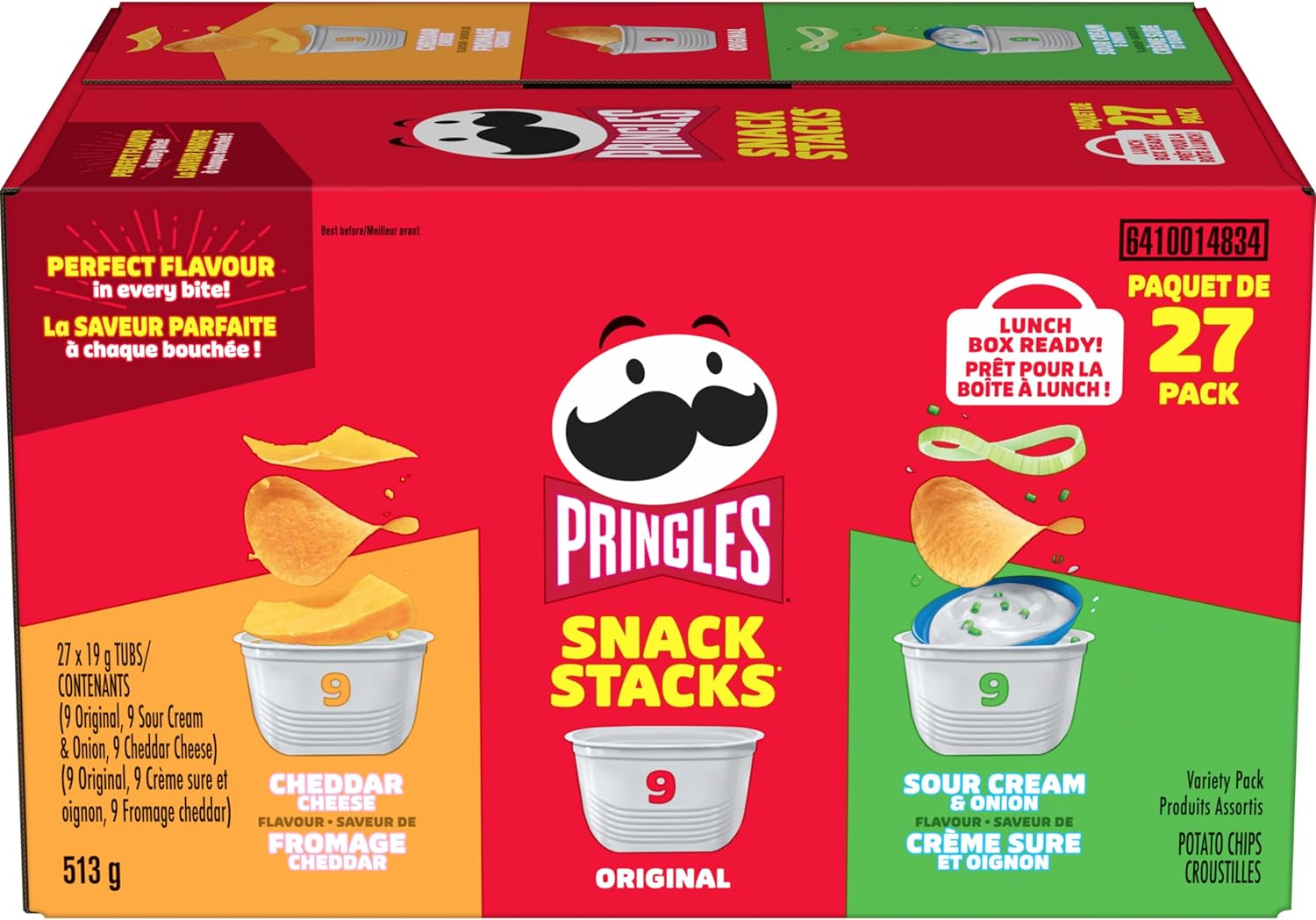 Includes one, 513 g box containing nine cups each of Sour Cream and Onion, Original, and Cheddar Cheese Pringles potato chips.